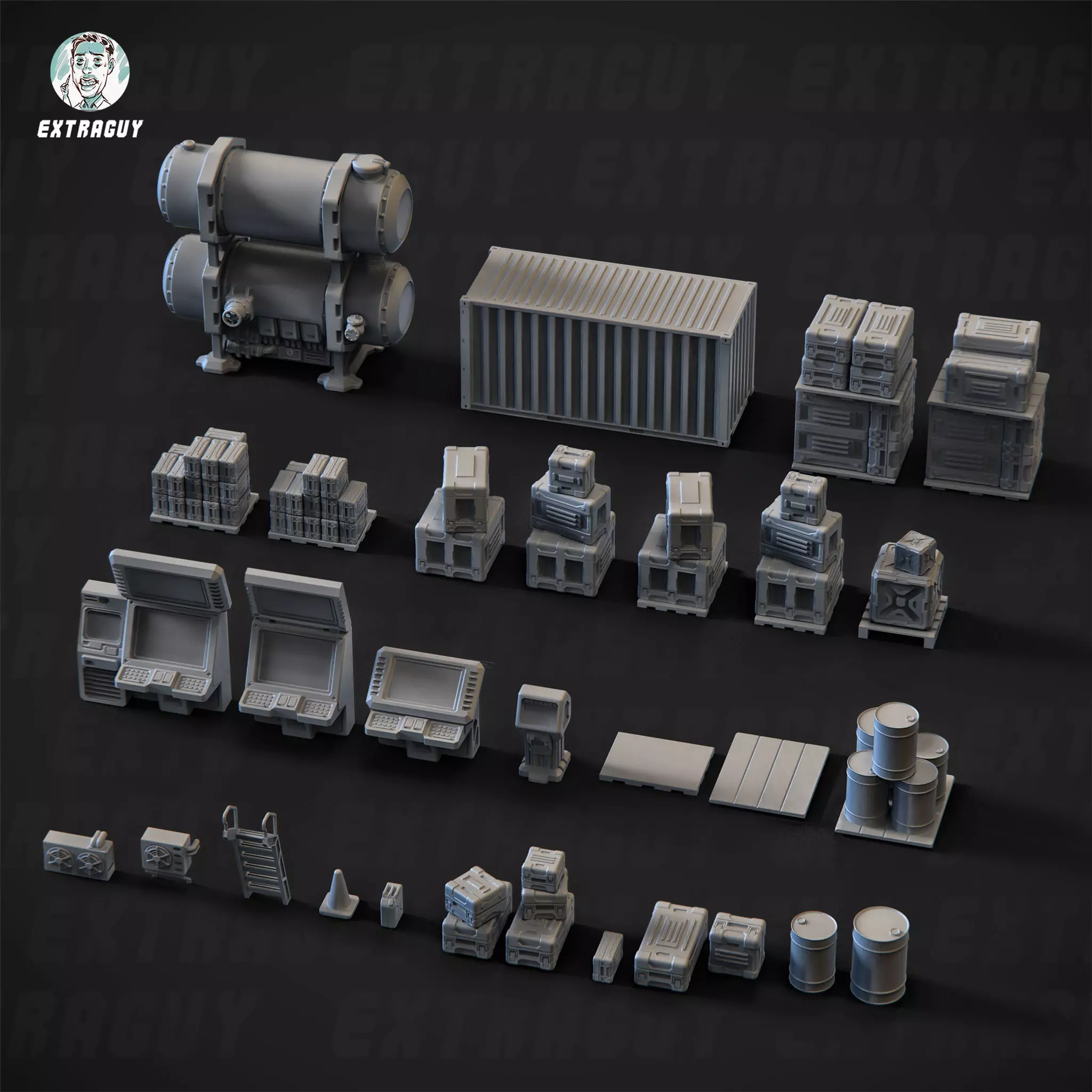 Ola, I present you Robotech Base PropsA total of 30 prop assetsto populate the Base DioramaAssets consist ofAC (2 versions)barrels (on pallet and stand alone)Boxes, crates (on pallet and stand alone)coneConsoles (various configuration)container vanpallet (2 version)fuel depotladderPetrol can