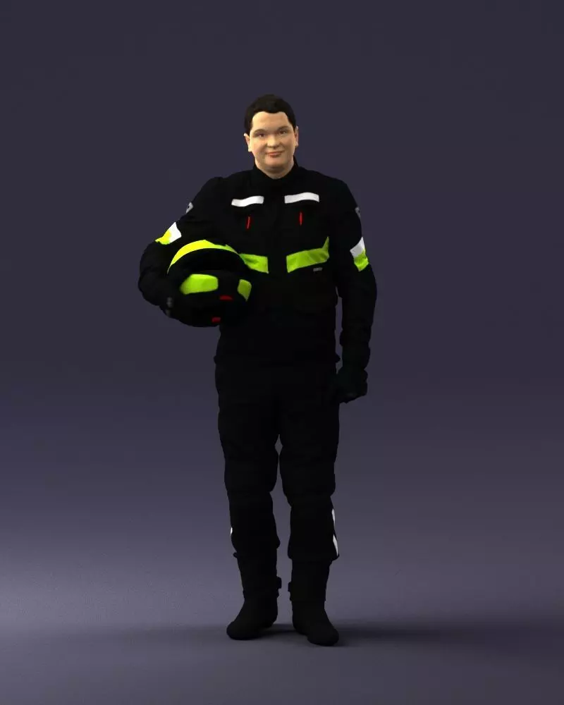 High-quality male biker figurine model, created using 3D scanning technology for realistic proportions and a stable standing pose. The riding suit and helmet prop make this model perfect for motorcycle-themed dioramas, modern miniature scenes, and collectible character sets.