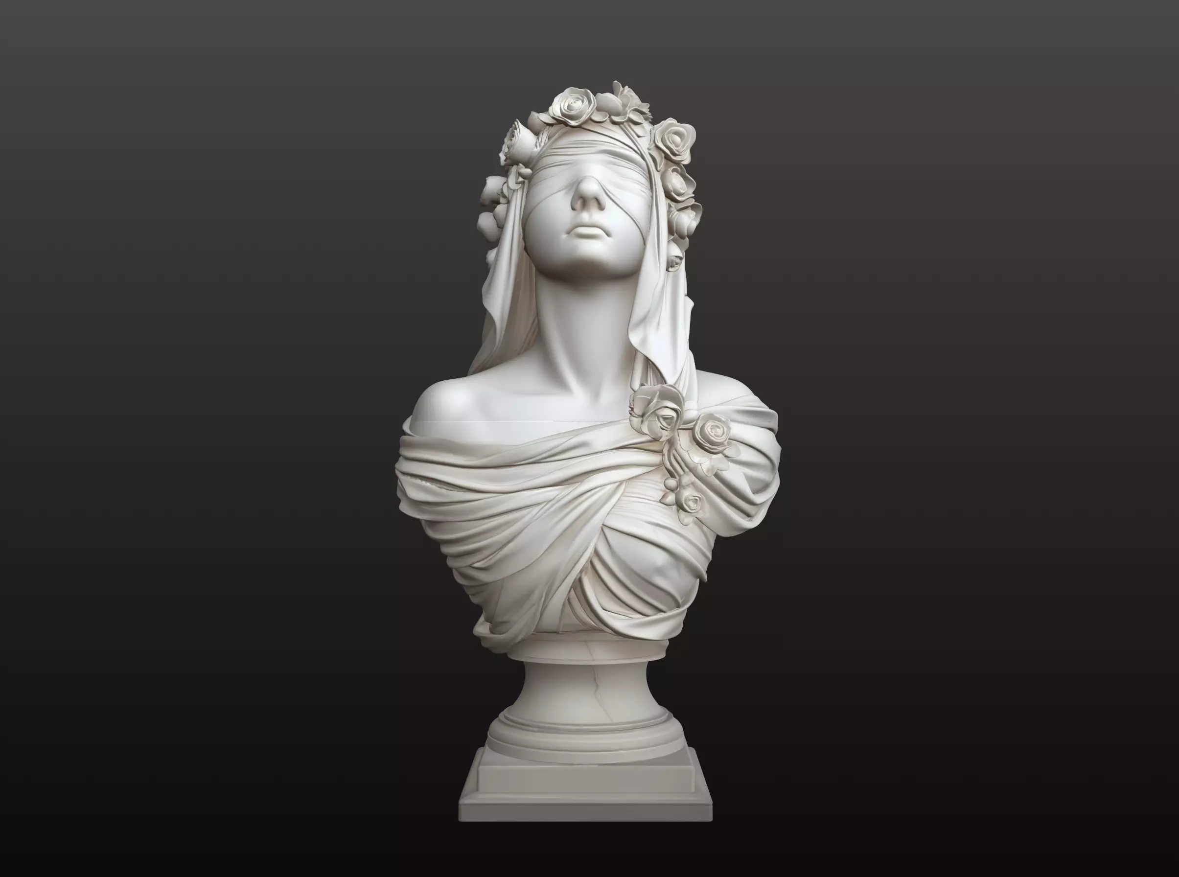A stunning and refined 3D bust inspired by the timeless image of the blindfolded goddess. This sculpt features an enchanting and realistic face, delicately covered by a flowing veil rich in folds and fine details. The composition is further enhanced by beautifully sculpted roses and ornamental decorations that frame the figure, all resting on an elegant display base.