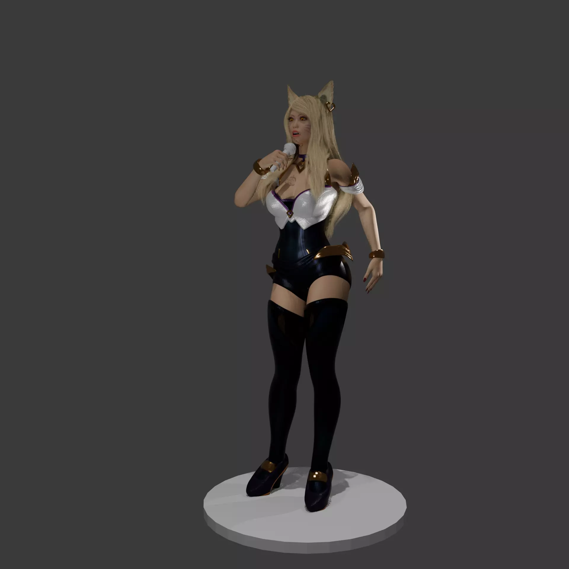 A stylized 3D-rendered female pop performer posed on a circular display base against a smooth gradient background. The character is depicted mid-performance, holding a microphone with a confident, expressive stance that suggests live singing or stage movement. She features long blonde hair, feline-inspired ears, and fantasy accessories that blend pop idol aesthetics with a whimsical, anime-influenced design. Her outfit combines a fitted stage costume with metallic accents, thigh-high stockings, and platform shoes, emphasizing a polished performance look. The rendering highlights clean topology, detailed materials, and balanced studio lighting, typical of game-ready or collectible character models.