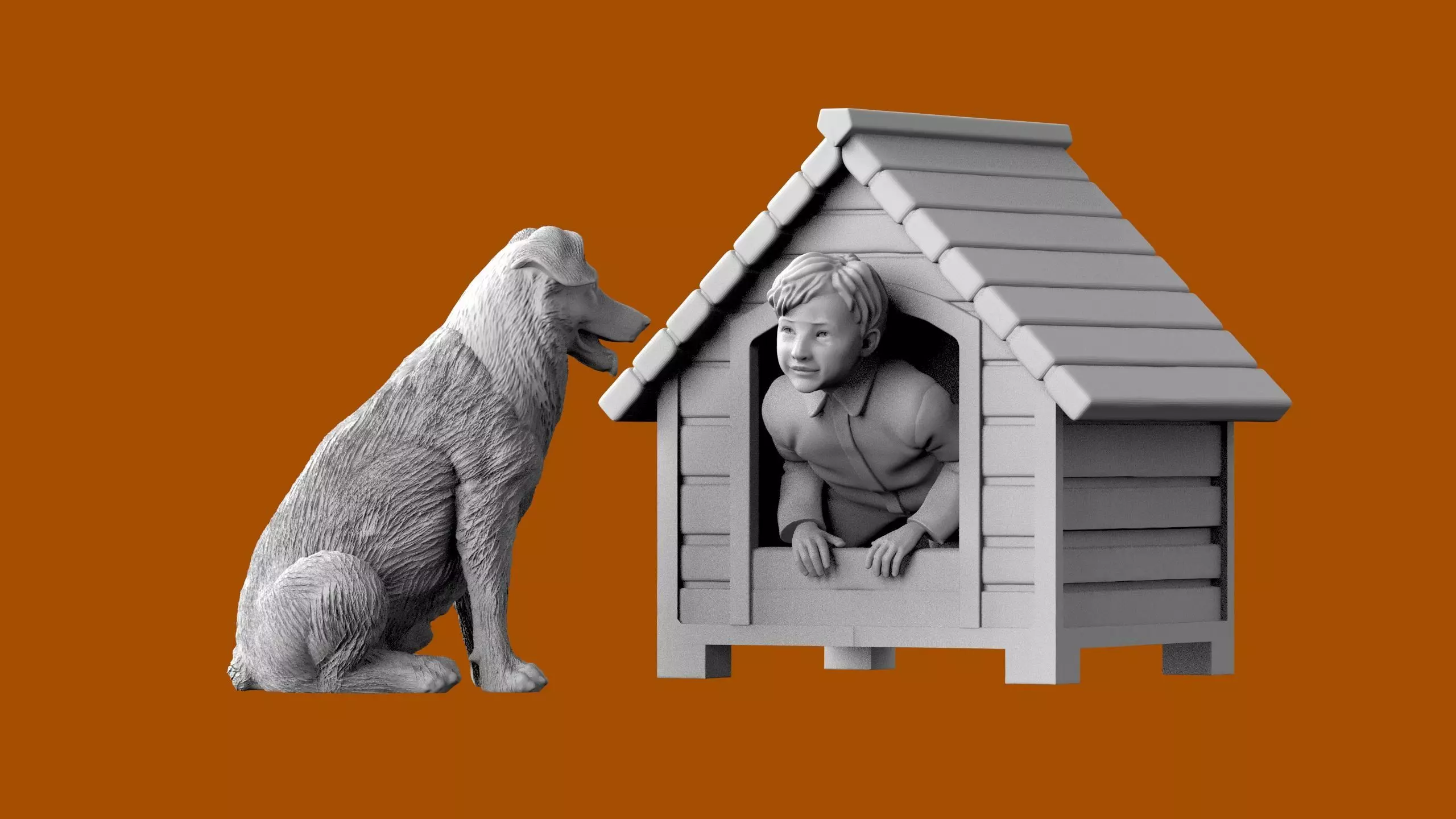 Fine details include facial expression, clothing folds, wood texture of the doghouse, and realistic fur sculpting.