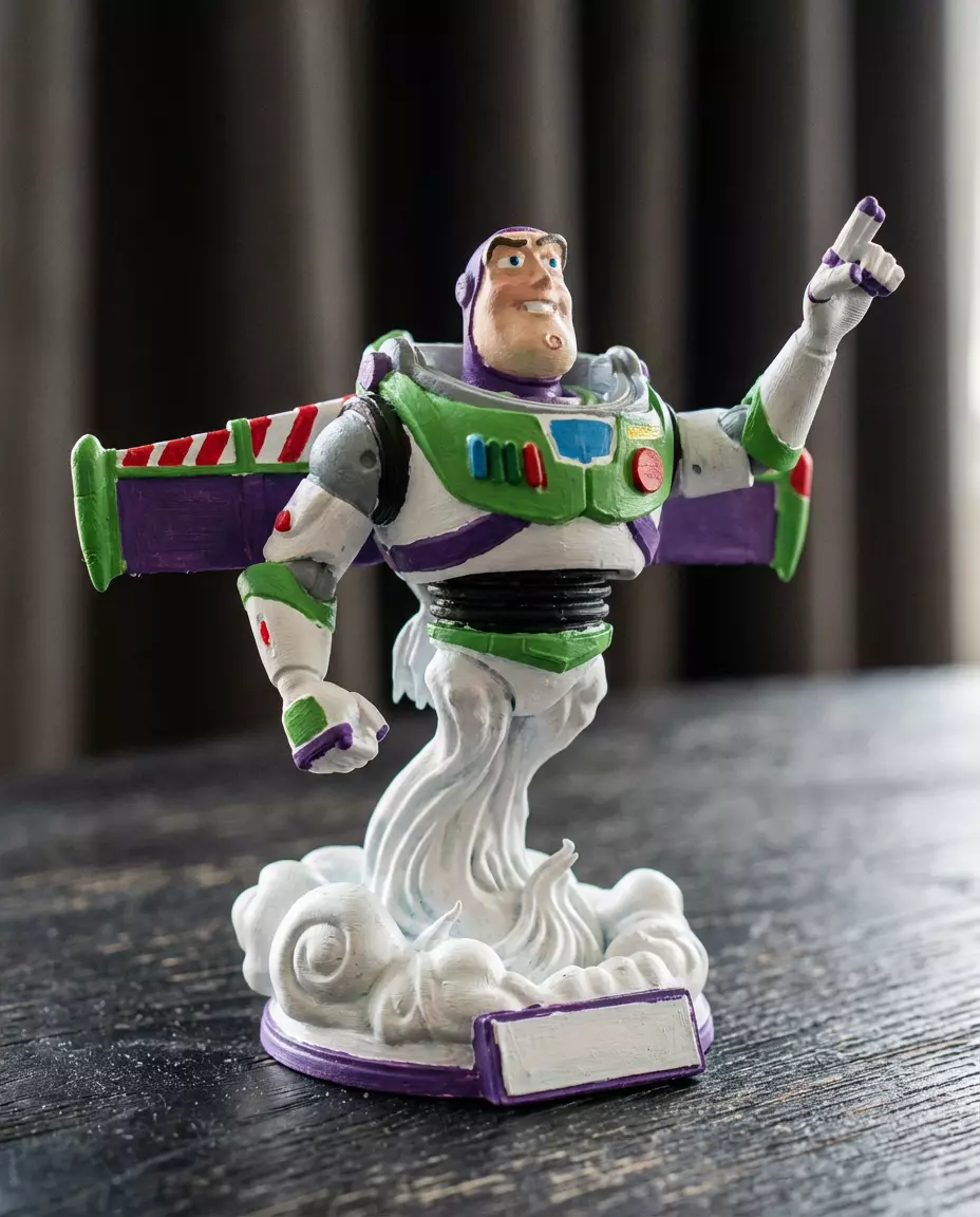 To infinity and beyond! This stylized Buzz Lightyear statue captures the Space Ranger mid-launch, with a swirling smoke and cloud base acting as the stand. A dynamic and heroic addition to any Toy Story fan's collection.