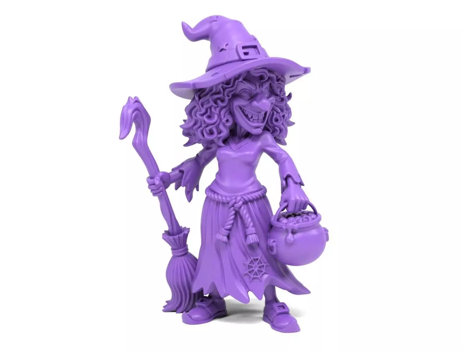 This cartoon witch figure combines playful and whimsical elements with a classic witch theme. It features exaggerated facial expressions and a stylized body, giving it an endearing character design while maintaining the iconic witch elements such as a broom, cauldron, and wavy hat.