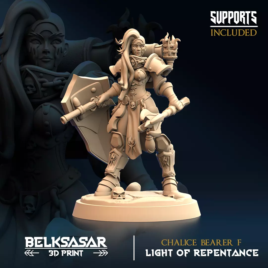 • Chalice BearerLike the paladin orders, these warriors march as the sacred chosen ones of the light of repentance, hiding their firearms behind their large shields, a single shot to avoid suffering to their victims.
