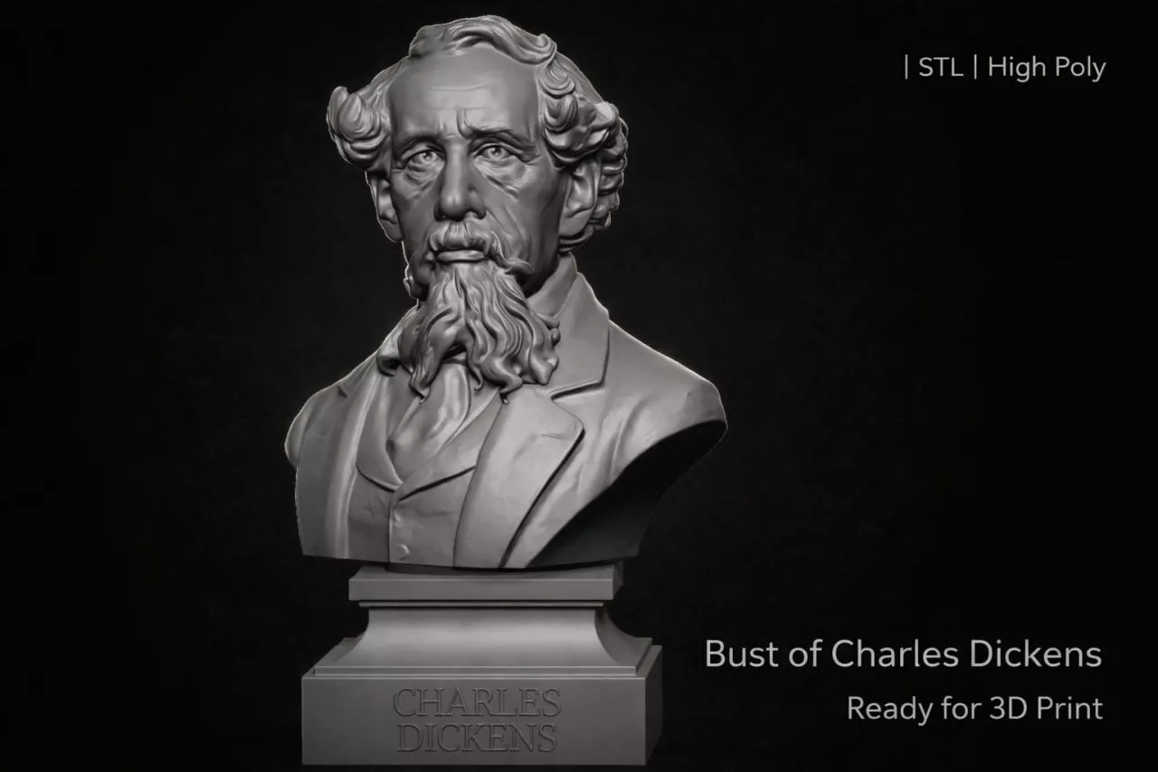Highly detailed bust of Charles Dickens, designed as a classical collectible sculpture for display, study, or 3D printing projects.The model captures the distinctive facial features, hairstyle, and beard of the renowned English writer, presented in a traditional bust format with a decorative base and engraved nameplate.