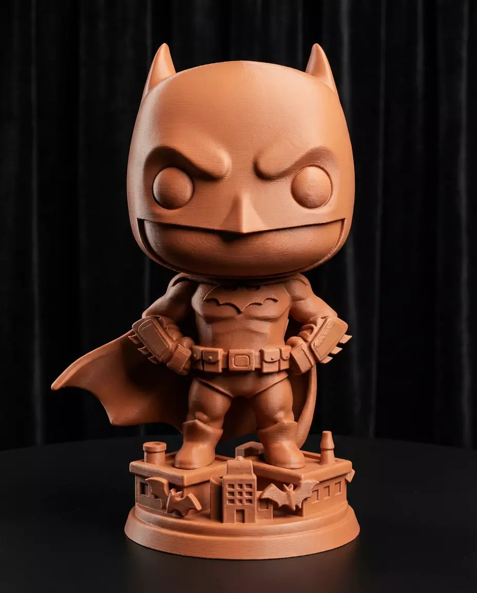 A stylized, 'big-head' take on the Dark Knight. This Chibi Batman stands guard over a miniaturized Gotham City base. Perfect for fans of comic books and collectors of stylized vinyl-style figures.