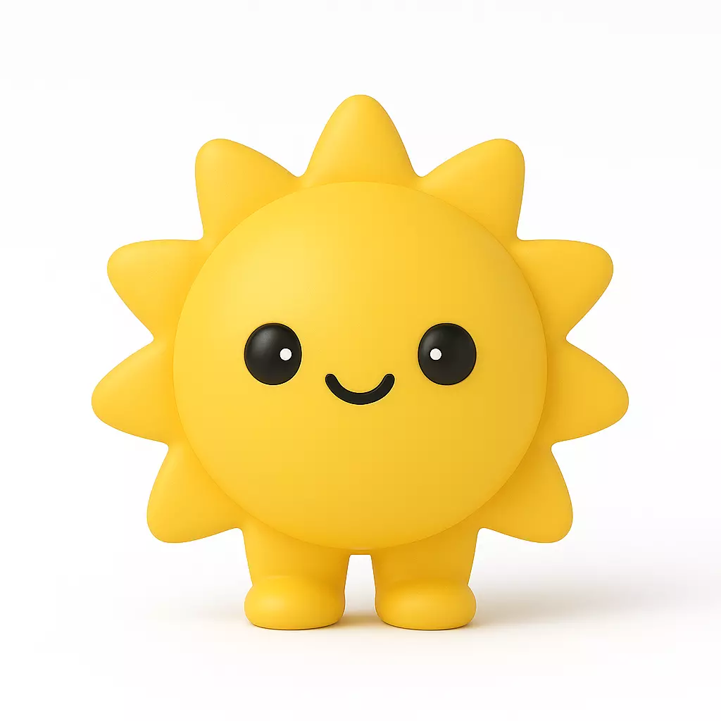A round chibi sun character with soft, stubby rays and tiny feet. The simple, fully fused silhouette makes it an easy, support‑free print that works perfectly as a cheerful desk mascot or window-sill decor.