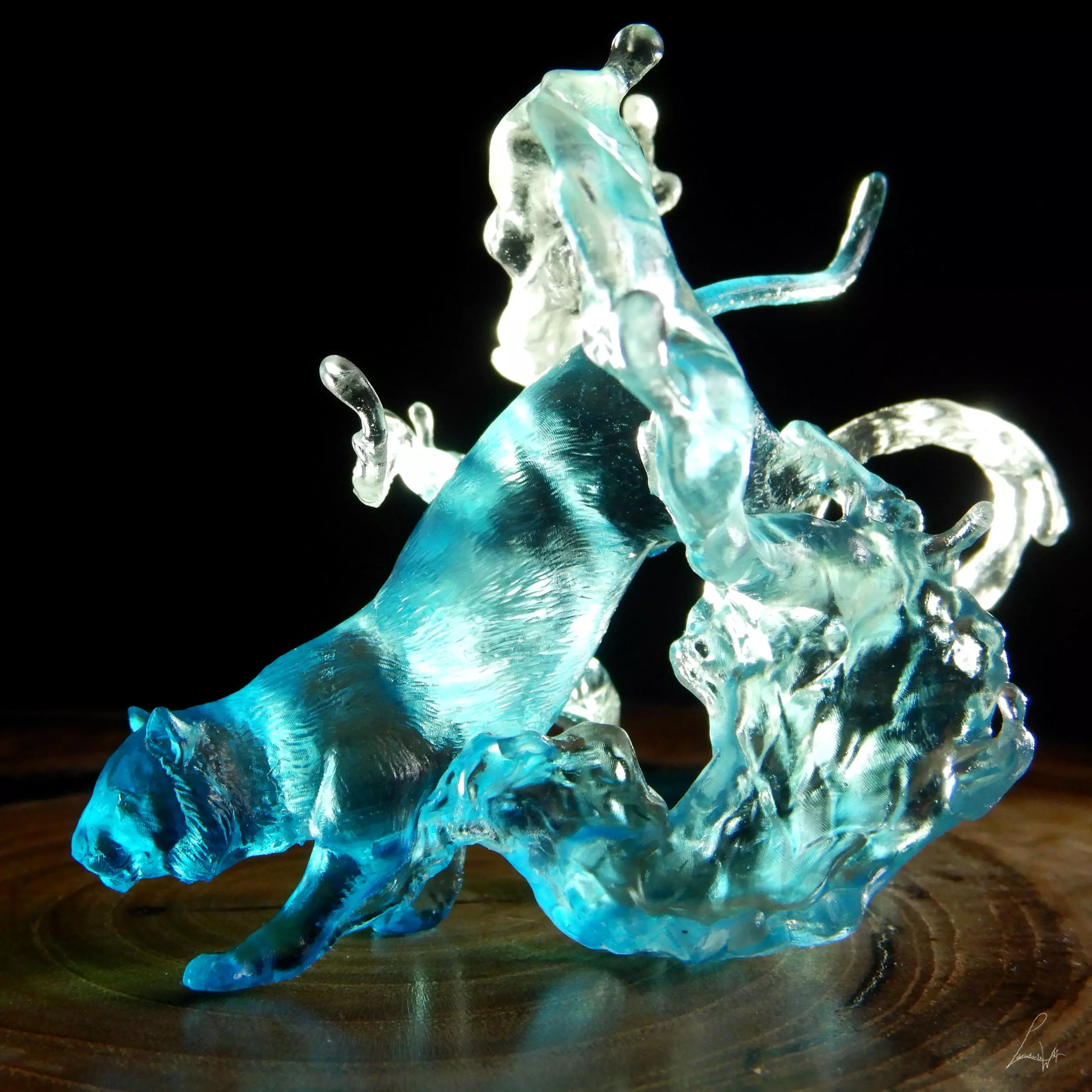To mimic the effect of water, I printed the file in translucent resin, dyed it with alcohol inks and then finished it with a coat of clear gloss varnish. It's the first print I did in translucent resin and I am in love with how easily you can change the appearance of your print with a little bit of the alcohol inks.