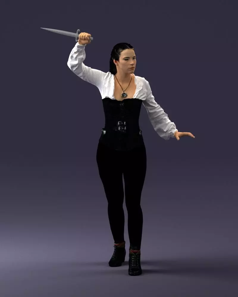 This high-resolution 3D model features a fierce female warrior in mid-action, holding a raised dagger and captured in a dynamic pose. Designed using 3D scanning technology and optimized for 3D printing, the model includes intricate details in clothing folds, corset lacing, jewelry, and facial expression. Ideal for fantasy dioramas, RPG miniatures, or collectible figure painting. The geometry is watertight, hollowed where appropriate, and pre-checked for resin or FDM printers.