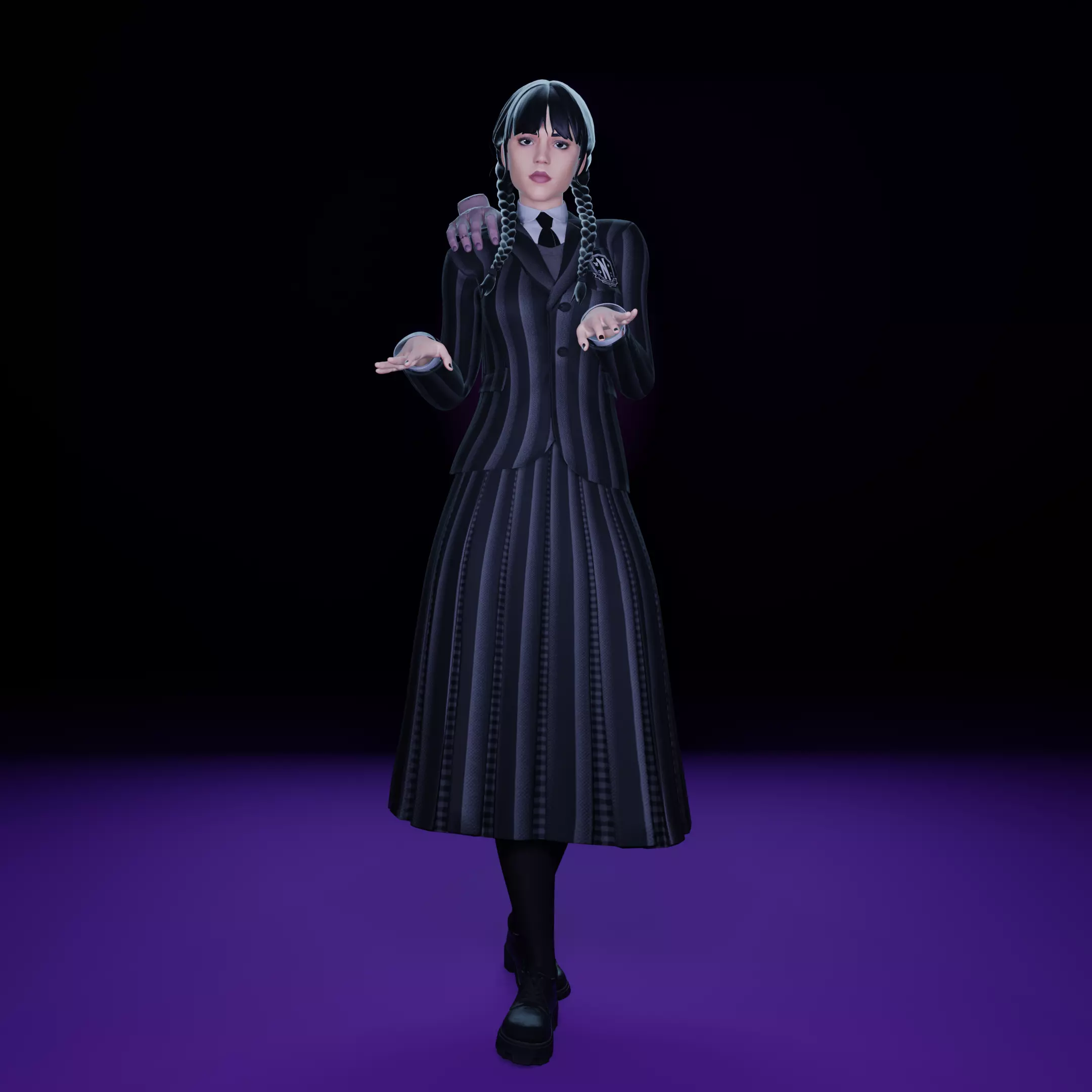 A stylized female character presented as a high-detail 3D model, standing in a composed and deliberate pose. She wears a dark, pinstriped formal outfit consisting of a fitted jacket and a long pleated skirt, paired with sturdy shoes. Her hair is styled in two neat braided pigtails with straight-cut bangs, reinforcing a disciplined and reserved appearance. One gloved hand rests on her shoulder while her palms are held outward, giving the pose a mysterious, almost ritual-like quality. The dark backdrop and minimal lighting emphasize her silhouette, posture, and controlled expression, creating a gothic and cinematic visual tone.