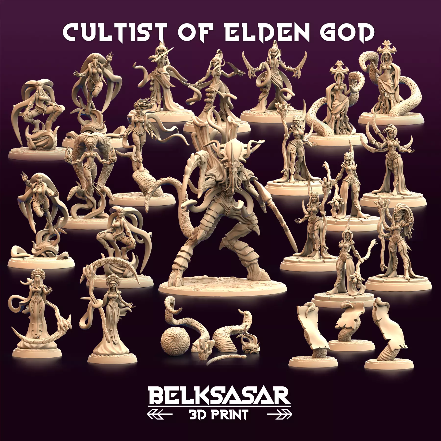 • Elden Aberration - Base 100mm• x2 Elden Ripper NSFW - Base 32mm• x3 Elden Scroll - Base32mm• x3 Elden Seed NSFW - Base 40mm• Mental Crawler NSFW - Base 40mm• Mental Crawler A 75mm NSFW - Base 75mm• x6 Vessel of Entropy NSFW - Base 40mm• x6 Zealot Cultist NSFW - Base 40mm• 7 Props• 20 Bases