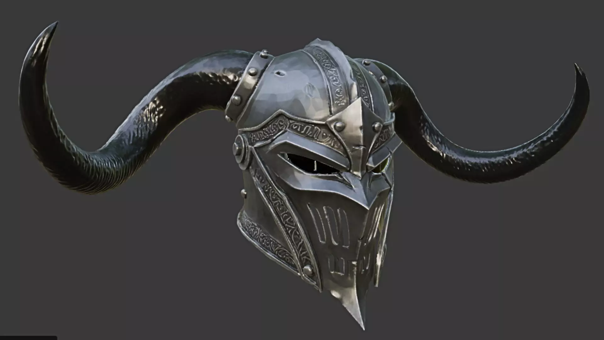 A highly detailed dark fantasy horned knight helmet designed for collectors, fantasy enthusiasts, and 3D printing. The model features large curved horns, engraved metal armor details, and a fierce warrior aesthetic inspired by medieval and dark fantasy armor designs.