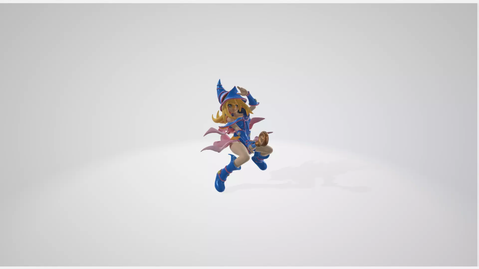 A dynamic, stylized 3D model of Dark Magician Girl, showcasing her iconic magical aesthetic with vibrant colors and intricate details. The pose is playful and confident, with one hand holding her magical staff diagonally and the other hand gesturing toward the viewer, radiating charm and magical energy.
