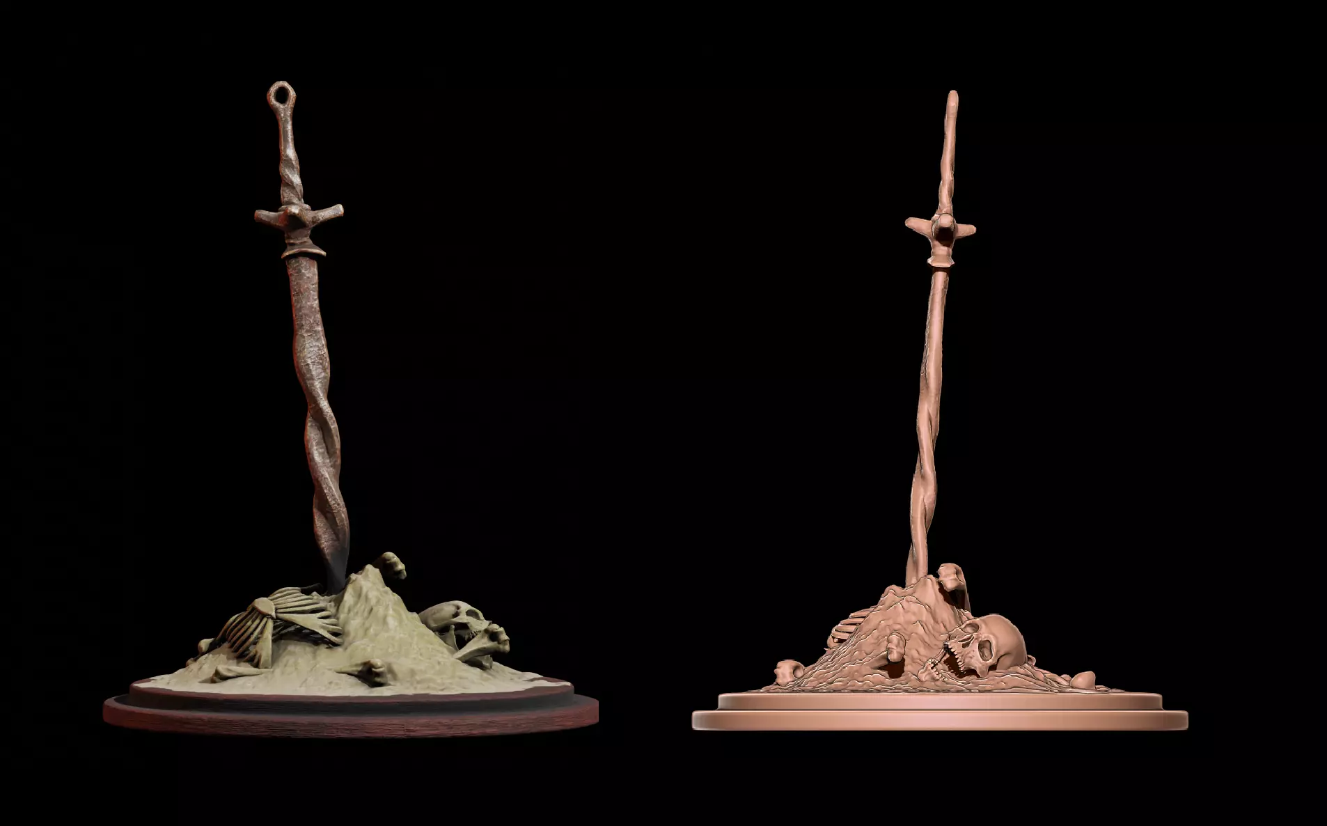 The sword features the texture of aged steel, resting in a realistic pile of ash and embers.The model is a solid one-mesh object, with a flat base for easy printing.