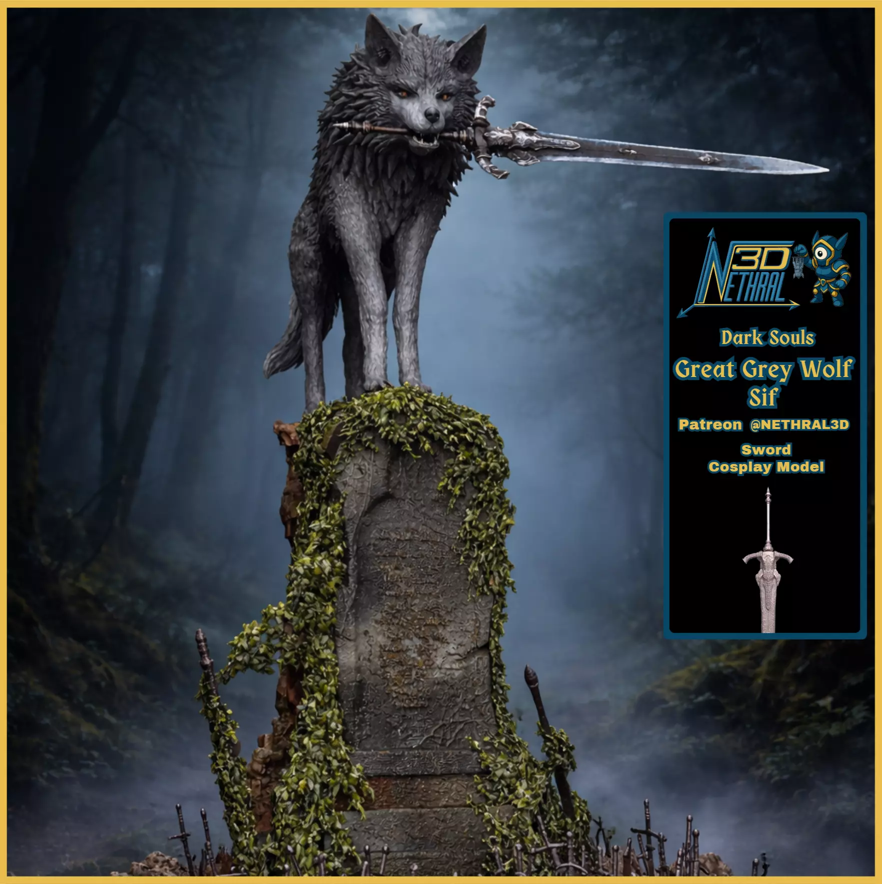 Great Grey Wolf Sif stands atop the grave of Artorias — elevated, vigilant, unyielding. The greatsword rests firmly in her jaws, perfectly aligned with her stance. This is not a passive guardian. She stands ready to strike anyone who dares approach.