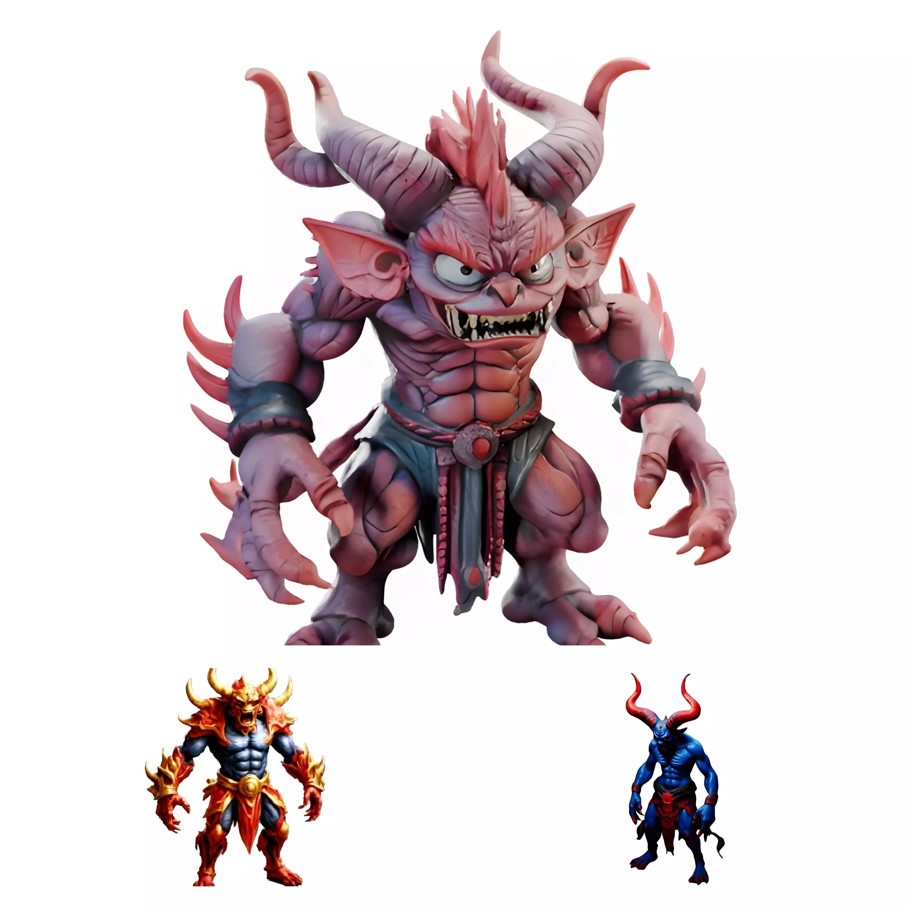 - The Brute Demon (Pink/Purple): A muscular, horned beast with sharp claws and intricate armor details. Its distinctive color gradient from pink to purple gives it a unique appearance.
