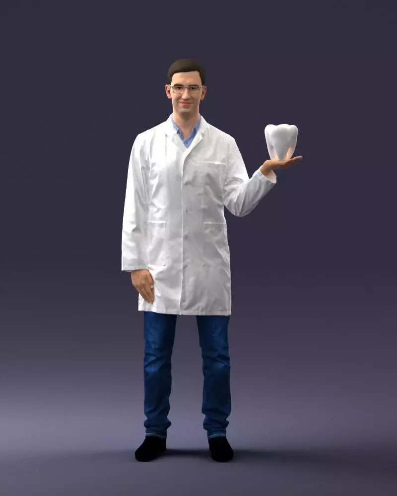 This high-quality 3D printable model features a dentist in a lab coat holding a large tooth, symbolizing dental care and oral health. With a realistic pose and professional attire, this model is ideal for dentists, medical professionals, educational purposes, and decorative office displays.