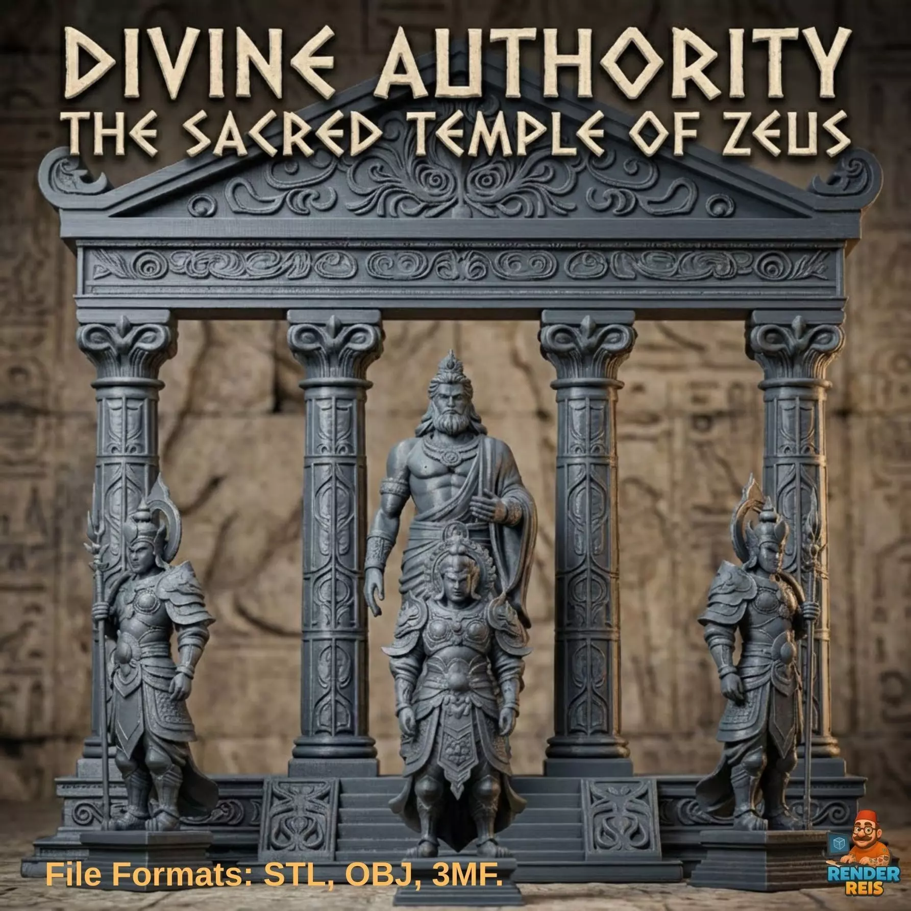 Contact me for custom models and projects.This scene is designed as a sacred ancient temple composition centered around the divine presence of ZEUS. Surrounded by four towering columns, the temple reflects godly power through elegant carvings, symmetry, and sacred architectural balance.