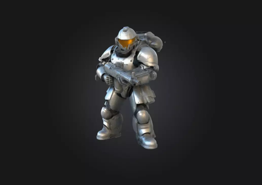 The Praetor Suit is intricately detailed, featuring deep battle scars, scratches, and worn metal plating that showcase the brutality of his fights. His reinforced gloves and boots display dents, dirt buildup, and realistic textures, emphasizing the ruggedness of his armor. The helmet’s visor has a slightly weathered, reflective surface, adding depth to the design.