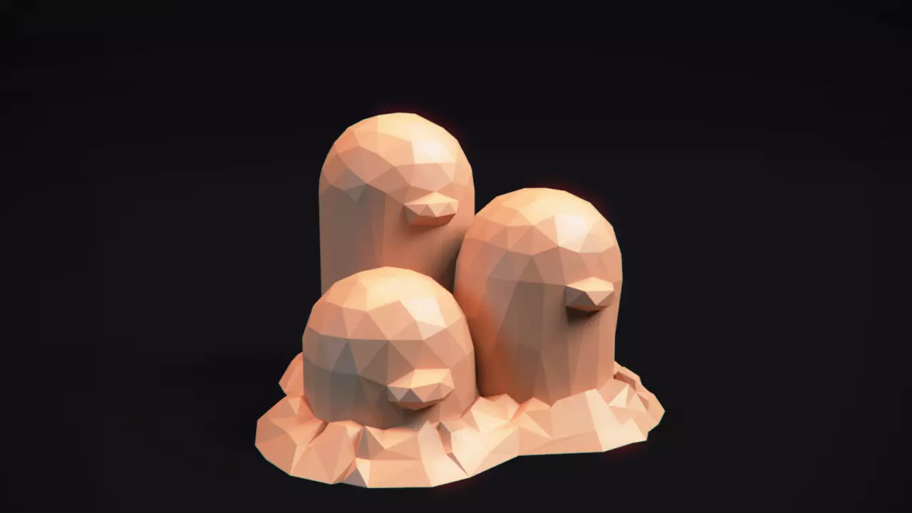 A low polygon style 3D figure of the famous Pokemon Dugtrio designed for 3d printing, jewelry, rendering, papercraft, etc.
