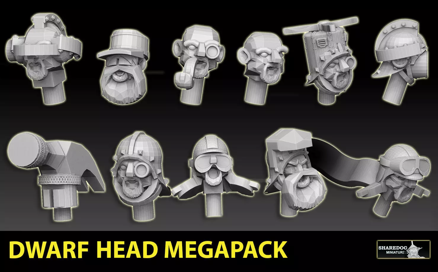 Please note: This collection is a roundup of heads originally used in a number of dwarf-themed products published by Sharedog Miniatures during March and April 2021. I've made some minor adjustments to the heads to make them easier to use with other miniatures (like the headless dwarf body included in the megapack), but this is a pretty rough porting. Depending on the shape and pose of the miniature, the heads might not be compatible (beards may get in the way and so on). Please take a close look at the images provided before purchasing, to determine if the heads have the right proportions for what you intend to use them for. Also note that the headless body included in this megapack will NOT work with every head in the megapack without some post-print modification.
