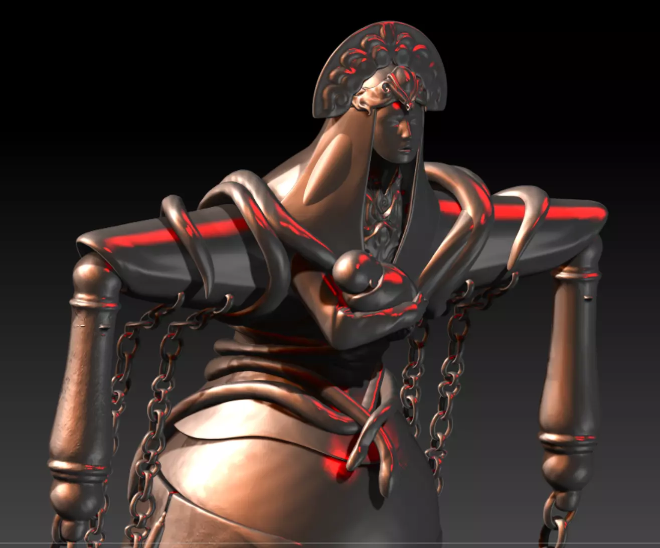 The Iron Virgin is a large metal construct resembling a metal statue of a saintly woman cradling a small silver baby to its chest, with several snakes winding around her upper body. From its shoulders hang a pair of long, spindly arms ending in one of two deadly weapons- a pair of pendulum blades on chains, or a pair of massive circular sawblades attached to long, rigid forearms. Its dress features a set of doors that swing open to reveal a hollow chamber full of blood-red fog and several metal snakes coiled up around a central rod hanging from below the Virgin's torso. Six of these metal snakes form a pair of long, tentacle-like arms, each made of three snakes wound together and ending in three-fingered hands, with the snakes' heads forming the fingers. Instead of legs, the Iron Virgin rolls around on a spherical wheel, allowing it to move in any direction horizontally without having to turn its whole body around.
