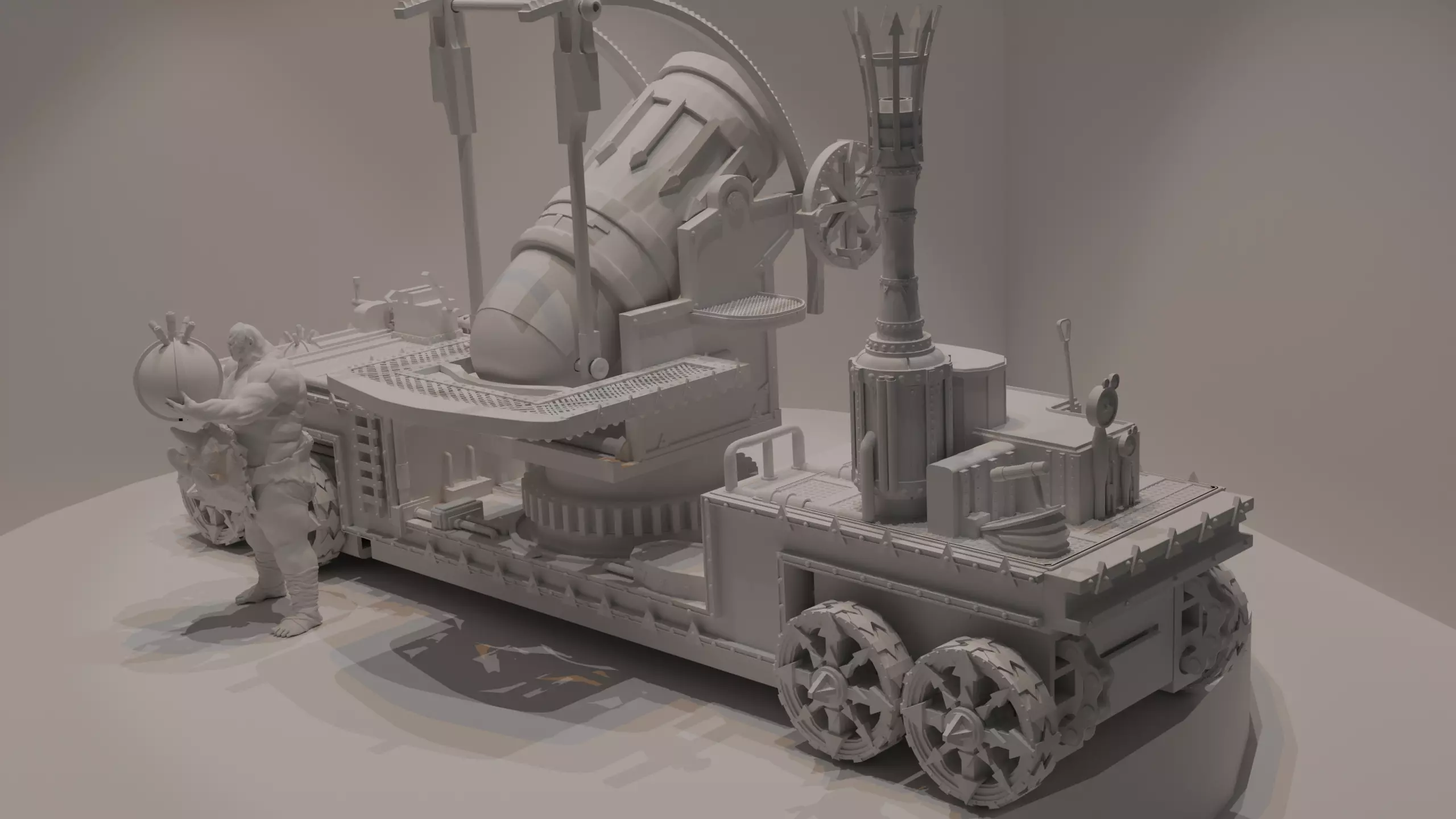 high detailed model, but static until its finished, when i finish this model will be able--->-to rollin on its wheels-the mortar towers every piece can moving, -lowering the cannon or making turn up, turning the whole tower in 360°-Next models can attach via hook system with each other-And finally Ogres and dwarf workers can be mount on this monster.