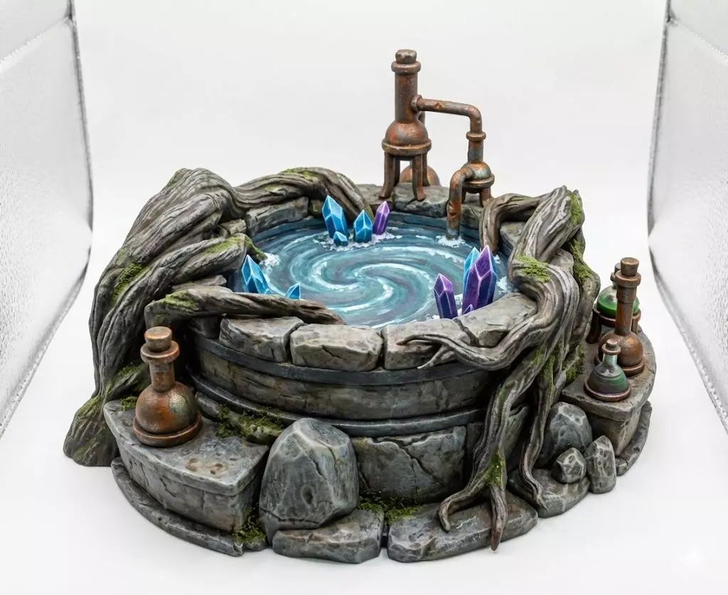 Bring a touch of arcane mystery to your tabletop adventures with this Stylized Alchemical Well. This unique scenery piece perfectly blends organic fantasy elements with Magitech aesthetics.The model features a sturdy stone basin filled with swirling magical liquid, overgrown with thick, twisted roots and studded with raw mana crystals. Alchemical piping and glass flasks suggest that this is not just a ruin, but an active site of experimentation or power extraction.
