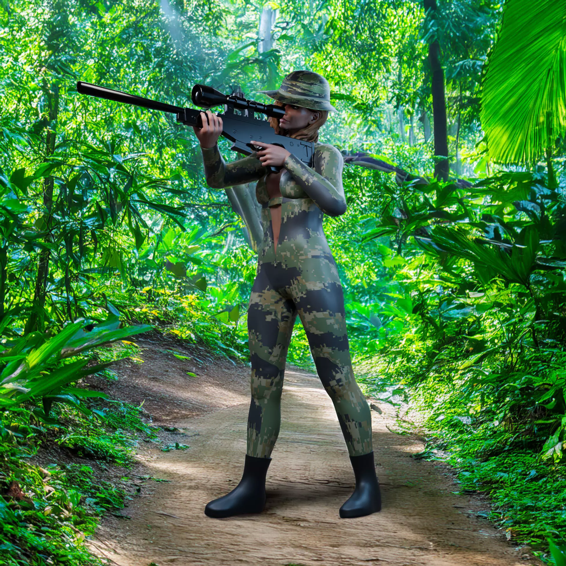 A highly detailed 3D model of a female special operations sniper posed in a ready-to-fire stance. The character wears a modern digital camouflage wetsuit-style uniform with tactical boots and a boonie hat, suggesting maritime or coastal operations. She is equipped with a suppressed sniper rifle fitted with a scope, held with realistic hand placement and posture. The model features a stylized yet realistic body proportion, clean topology, and smooth surface detailing, making it suitable for games, cinematics, renders, or promotional artwork. Ideal for military, stealth, or modern combat scenes.