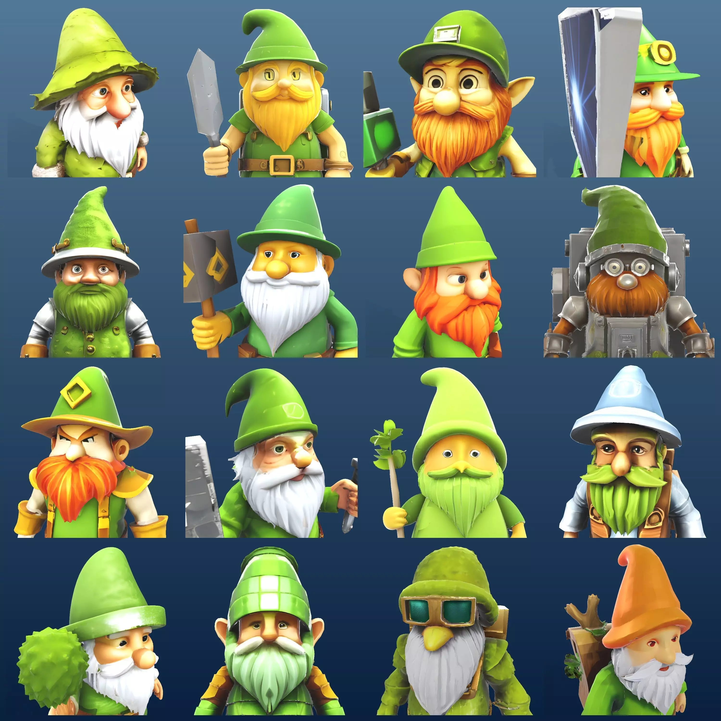 This collection showcases 16 meticulously designed garden gnome characters, each with distinctive features and occupations. The designs blend traditional gnome folklore with modern, playful aesthetics. Each gnome features: