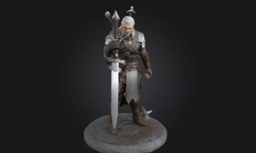 This highly detailed 3D printable statue of Geralt of Rivia captures the legendary Witcher in a calm yet powerful stance. Holding his silver sword with both hands, Geralt stands on a textured circular base, radiating his signature stoic and battle-worn presence. His armor, leather gear, and swords are intricately sculpted for maximum realism.