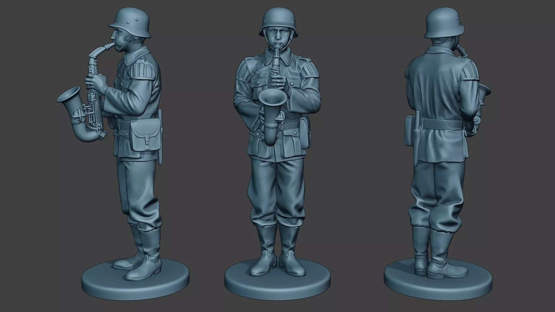 - Wehrmacht soldier model with different musical instruments. German soldier musician model. Model on stand pose with a saxophone. Model part of a complete musical band.