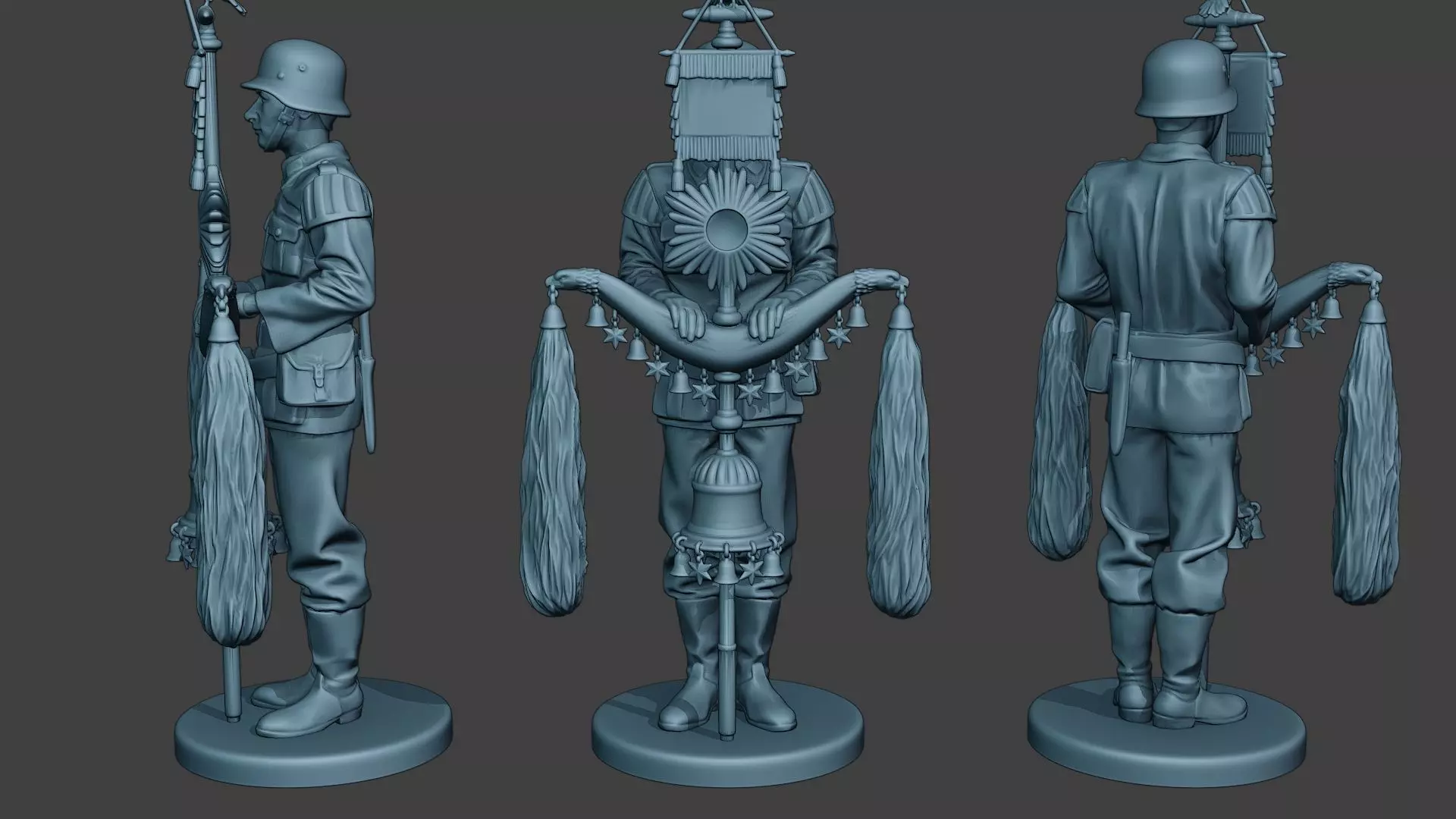 - Wehrmacht soldier model with different musical instruments. German soldier musician model. Model on stand pose with a Schellenbaum. Model part of a complete musical band.