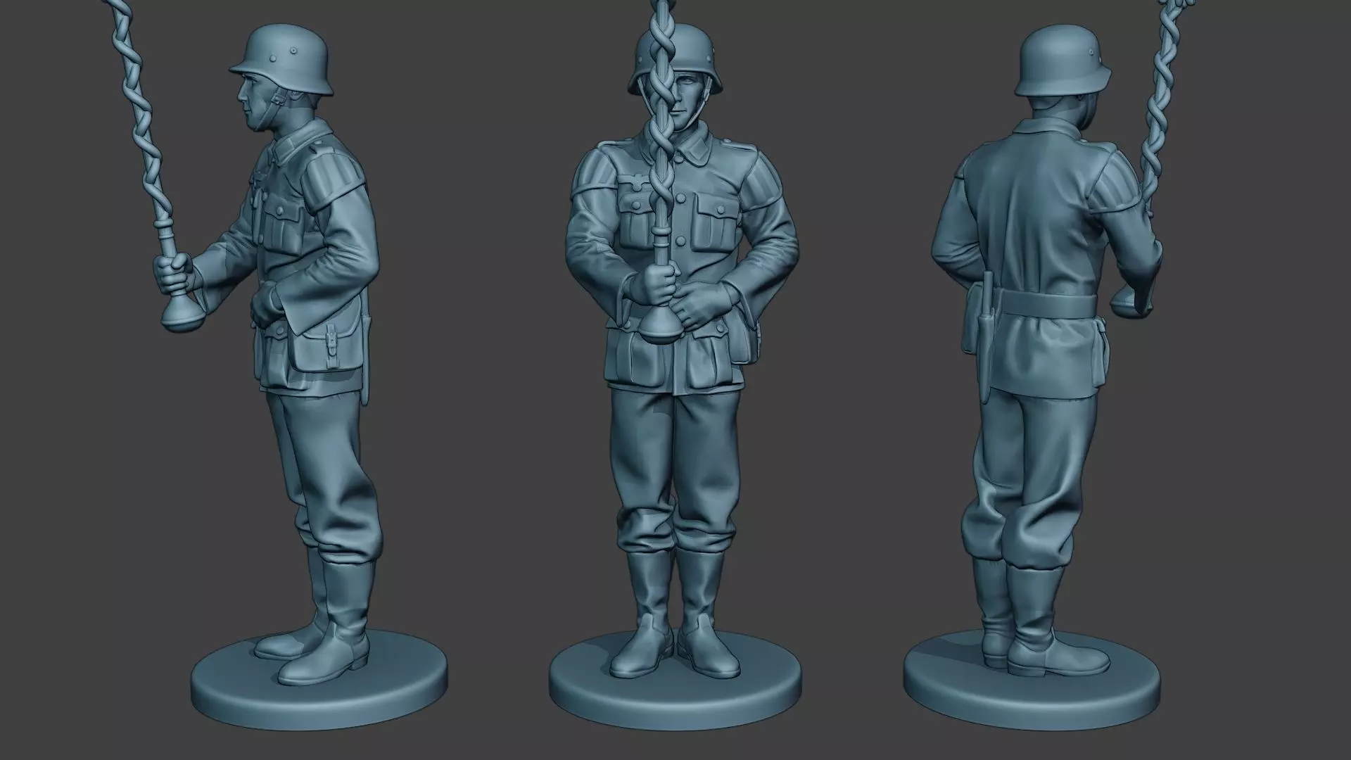 - Wehrmacht soldier model with different musical instruments. German soldier musician model. Model on stand pose with a Tambourstock. Model part of a complete musical band.