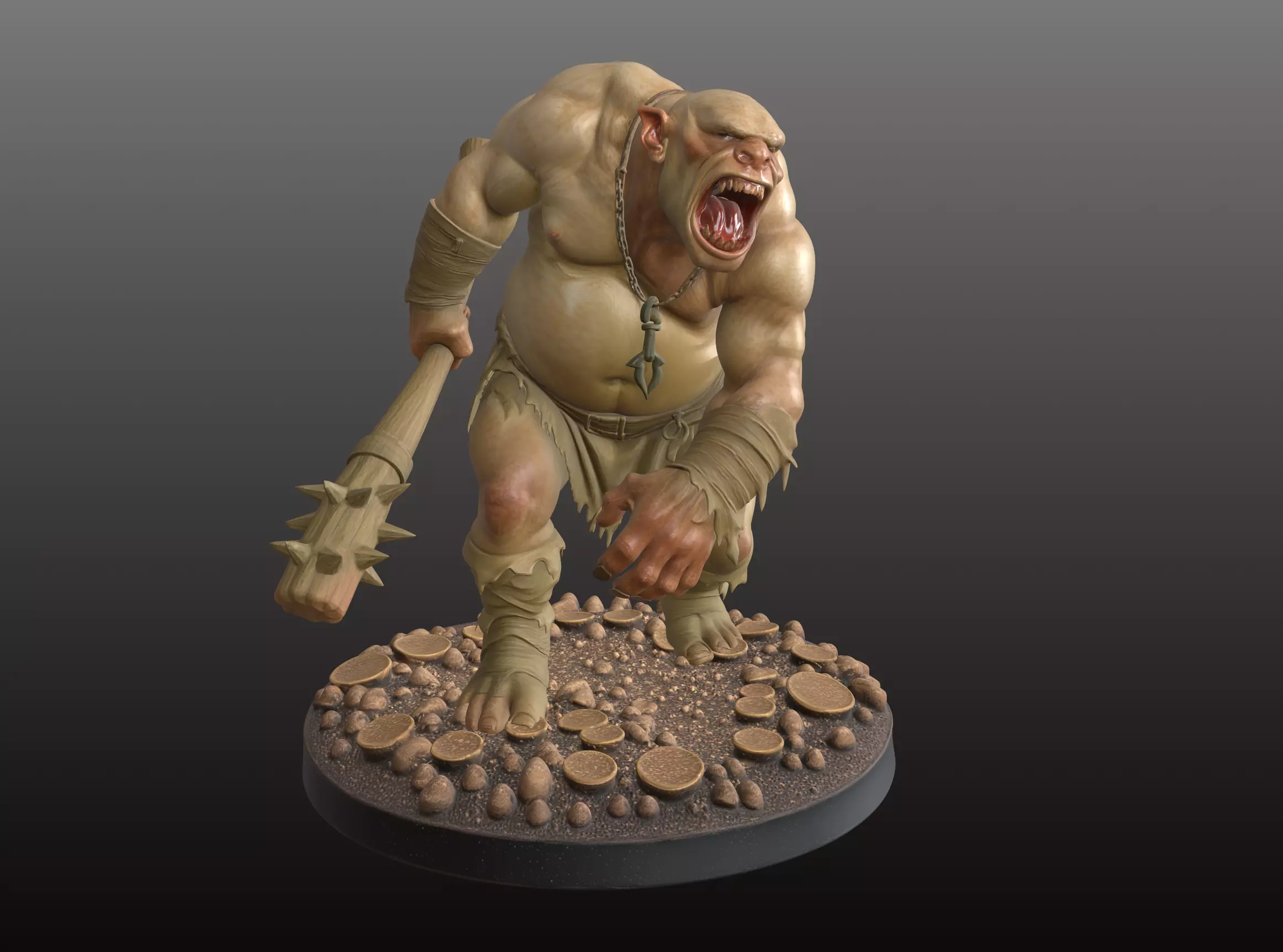 A massive and terrifying 3D model featuring a monstrous giant inspired by classic fantasy mythology. This towering creature is captured in a powerful roaring pose, unleashing its fury as it charges into battle. With exaggerated proportions, rugged skin textures, and a savage expression, this giant stands as a formidable presence in any fantasy world. The model includes a detailed base of rocks and terrain, grounding the figure and enhancing its dramatic stance. A perfect centerpiece or enemy unit for your tabletop adventures and monster displays.