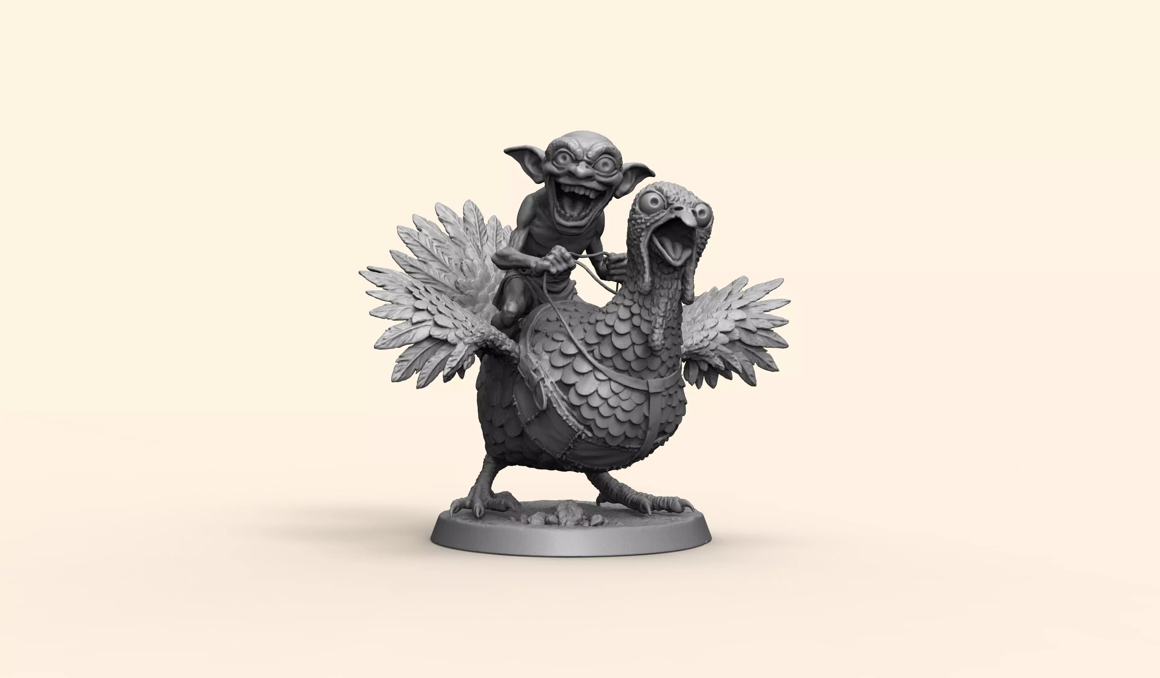 You are purchasing a high-quality fantasy STL model featuring a crazy goblin rider mounted on a giant turkey.This humorous and detailed miniature is perfect for tabletop RPGs, fantasy dioramas, display collections, or comedic tabletop scenes.