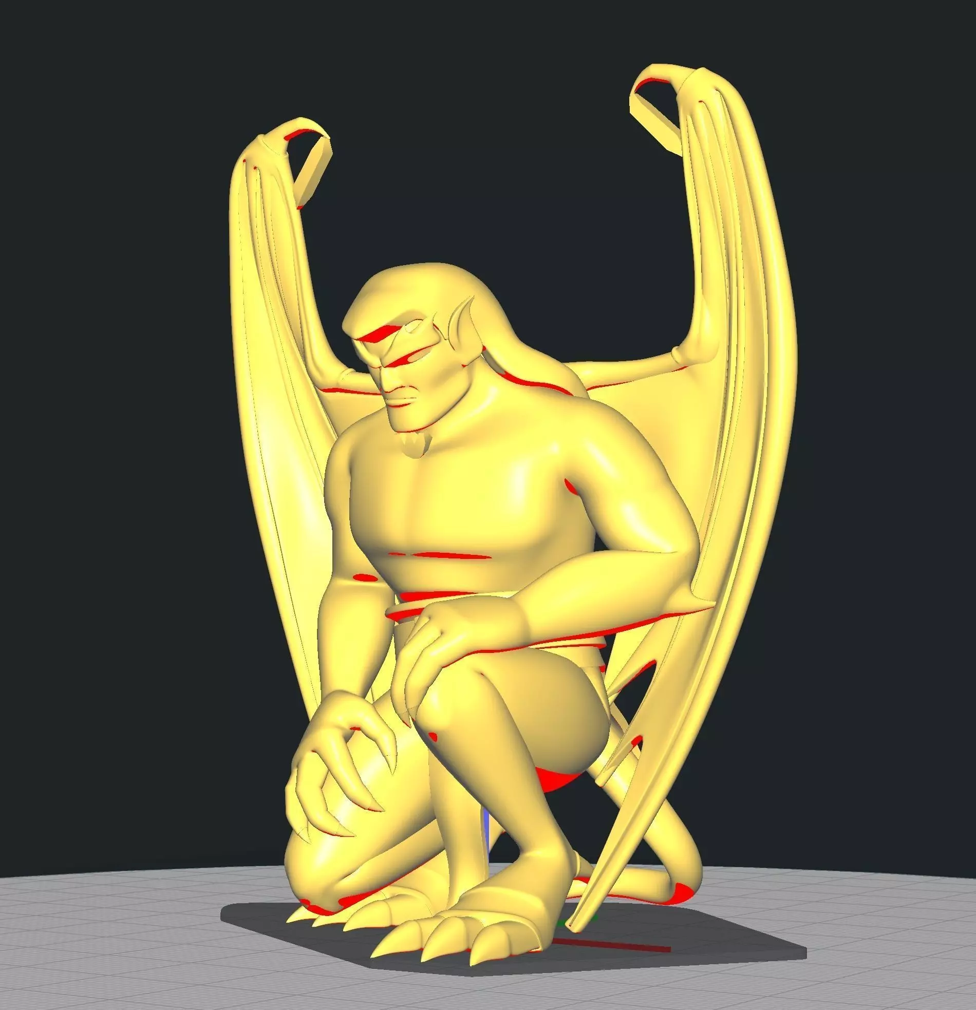 Goliath is based on the character featured in the 90s animated series, Gargoyles. Goliath has been posed to mimc the pose taken while he slept atop a roof or castle. The model is detailed, capturing the personality and style of the show at a default height of 80mm. If he were not kneeing, he'd be at least 150mm tall. Some areas have been thickened to ensure better strength and successful printing. After some consideration, I reduced his wingspan to make printing easier and a support was added beneath the chin to reduce overhang issues.
