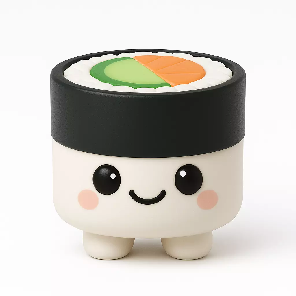 A chunky sushi roll character with a rounded rice body, smooth seaweed wrap, and bright topping details on top, plus a big happy face on the front. All elements are fused into one print-safe solid piece.