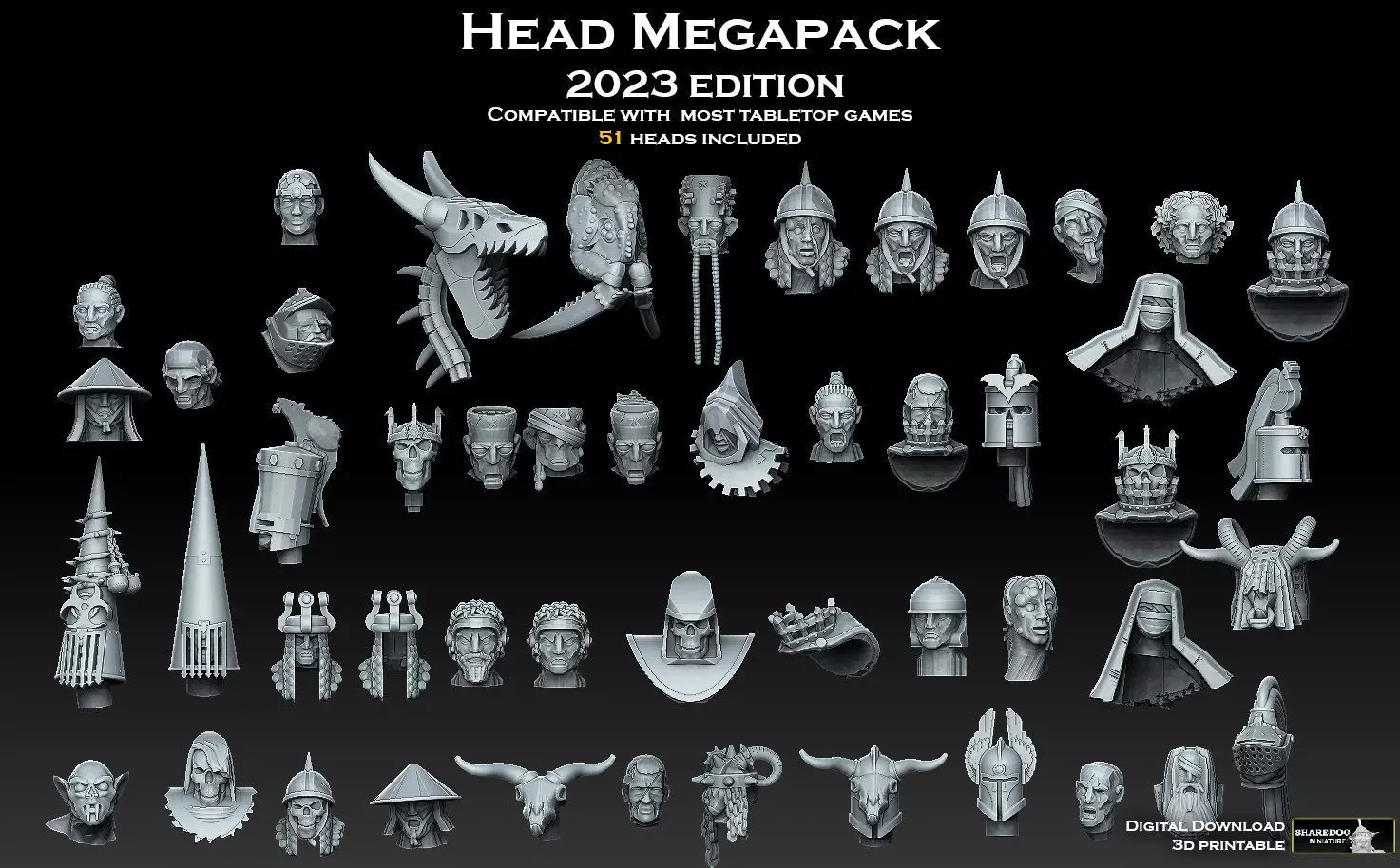 Roundup of heads originally used in a number of separate tabletop miniature releases over the course of 2023, collected into a megapack.