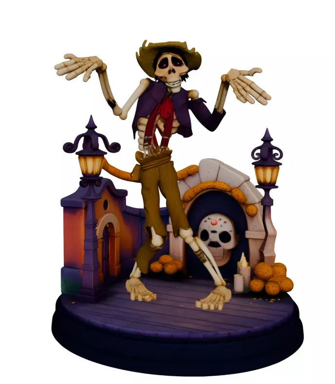 The figure depicts Héctor with his worn mariachi suit, slightly tilted hat, and that very human expression that made him win everyone's heart. Every detail has been carefully modeled: from the exposed bones of his hands to the tears in his clothing and his highly emotional facial expression.
