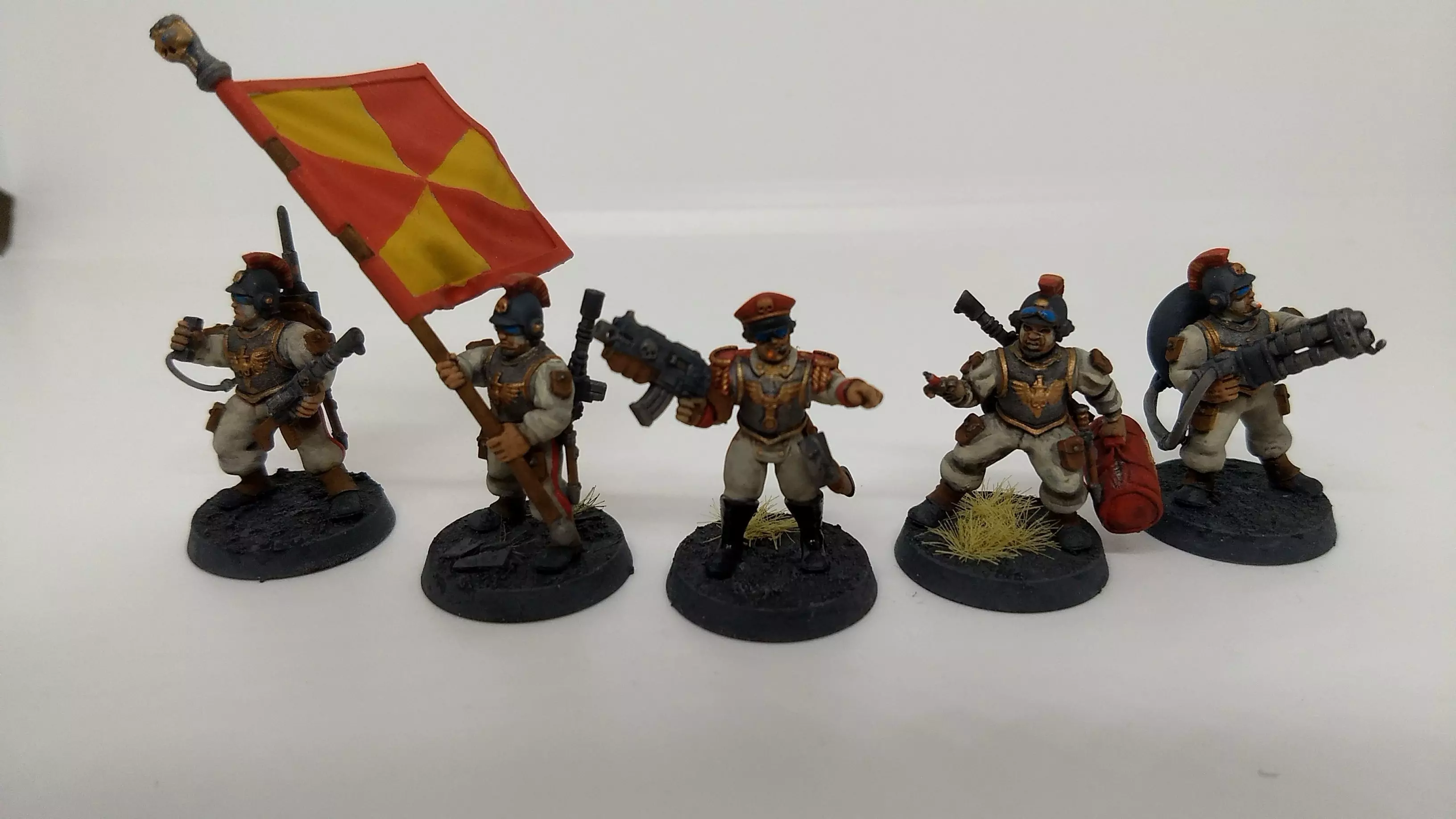 A multipart command squad including torsos, arms, heads and accessories for use in 28mm heroic scale sci-fi wargaming. Includes 8 variations of torso, as well as 3 officer torsos, 4 veteran heads, 4 officer heads, command squad equipment including 2 banners, a radio, a medic bag and 2 arms wielding lasguns, accessories including radio backpack, scabbards, holsters and grenades and various guns and close combat weapons for the officers.