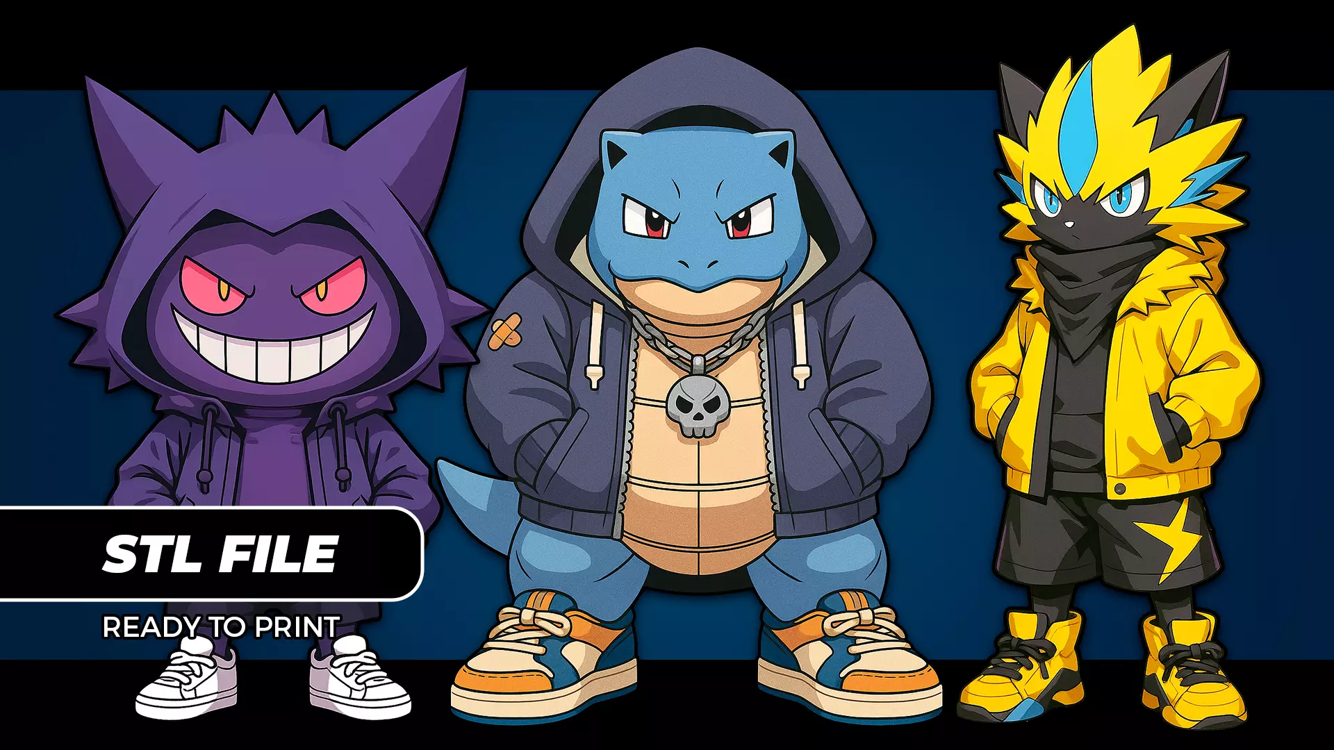 Characters Included:Blastoise – standing tall in a hoodie and sneakers, exuding fiery attitude Gengar – mysterious and powerful, wearing a modern streetwear outfit Zeraora – fierce, dressed with swag and personality