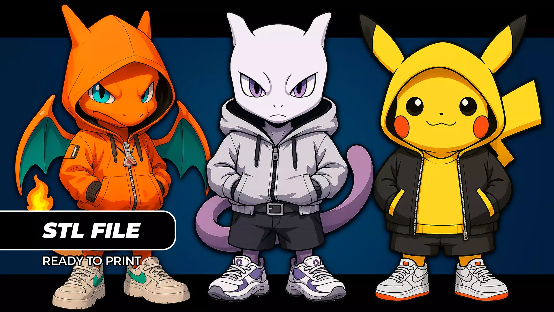 What's Inside:3 STL files (Charizard, Mewtwo, and Pikachu in streetwear)