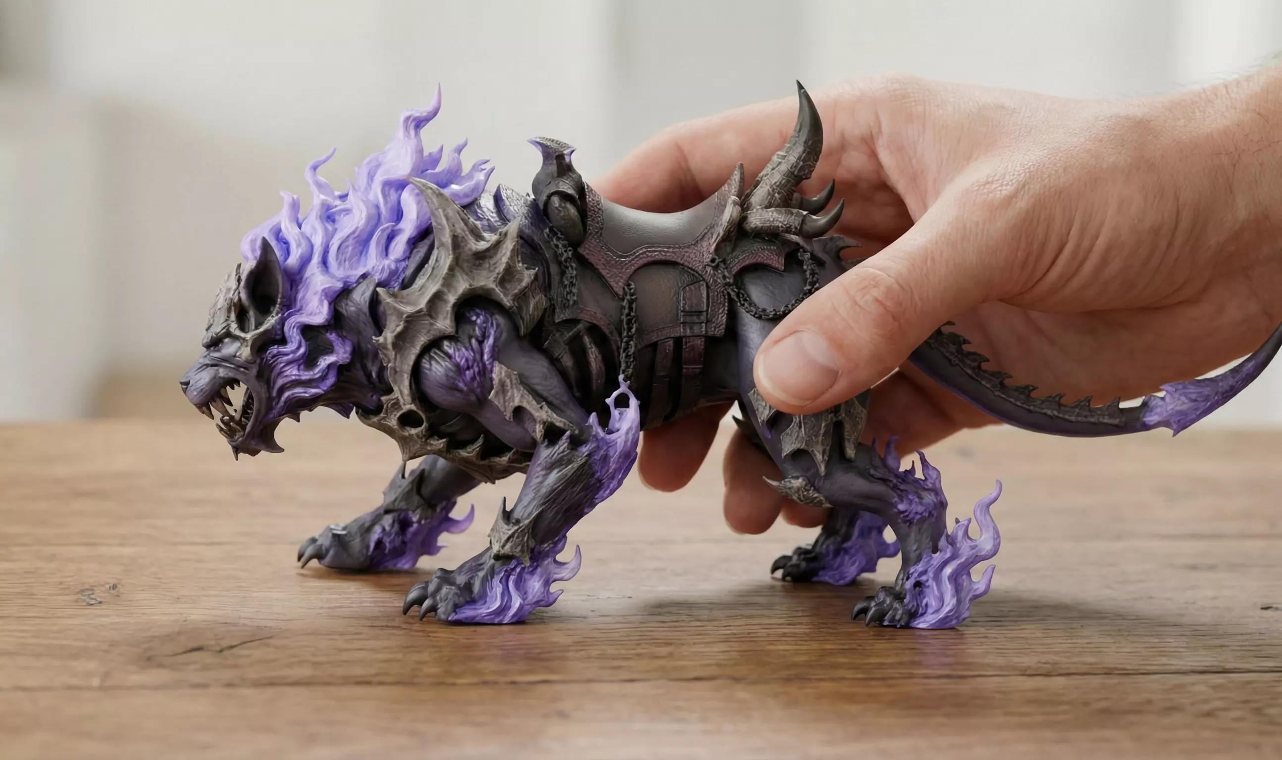 This high-detail Infernal Demon Beast is an original dark fantasy creature designed for 3D printing, display, and collectible statue creation. The model features a powerful quadruped stance, spiked armor-like anatomy, demonic horns, and ethereal purple flames, giving it a menacing and premium presence.