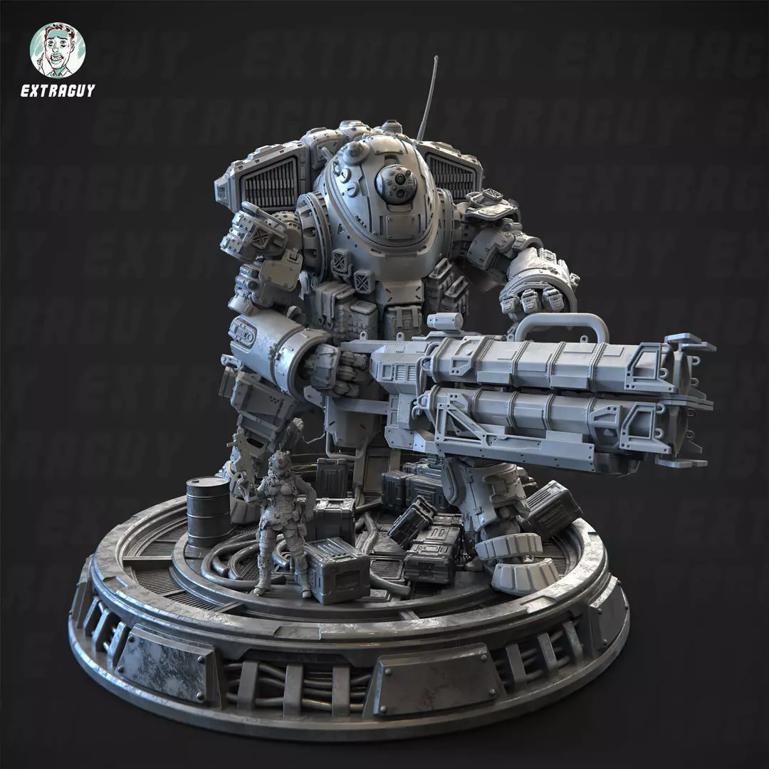 Ola, I present you the Titan Scorch Static 100mm setMech is about 114mm in height set to scale to a 32mm HumanApproximate dimension of the set plus (Mech+Base) are as followsHeight: 120mm Width: 138mm Depth: 151mmAsset is cut in parts for easy assemblycomes with 2 Weapons (thermite launcher, rocket launcher)Pilot on cockpit and standing Pilot at 32mm scale2 arm versions for to hold the 2 weaponscustom base and crate propsAll files are in STL formatFiles includesSupported and Unsupported STLsLychee source fileAssembly guideRendered imagesReference model(not suited for print, just for assembly reference)Files are for 3D Print only, not suited for animationPlease subscribe to my Youtube to see whats cookingyoutube.com/@ExtraGuy_Miniaturesor join my discord for updatesdiscord.com/invite/HdTpjXJHvS