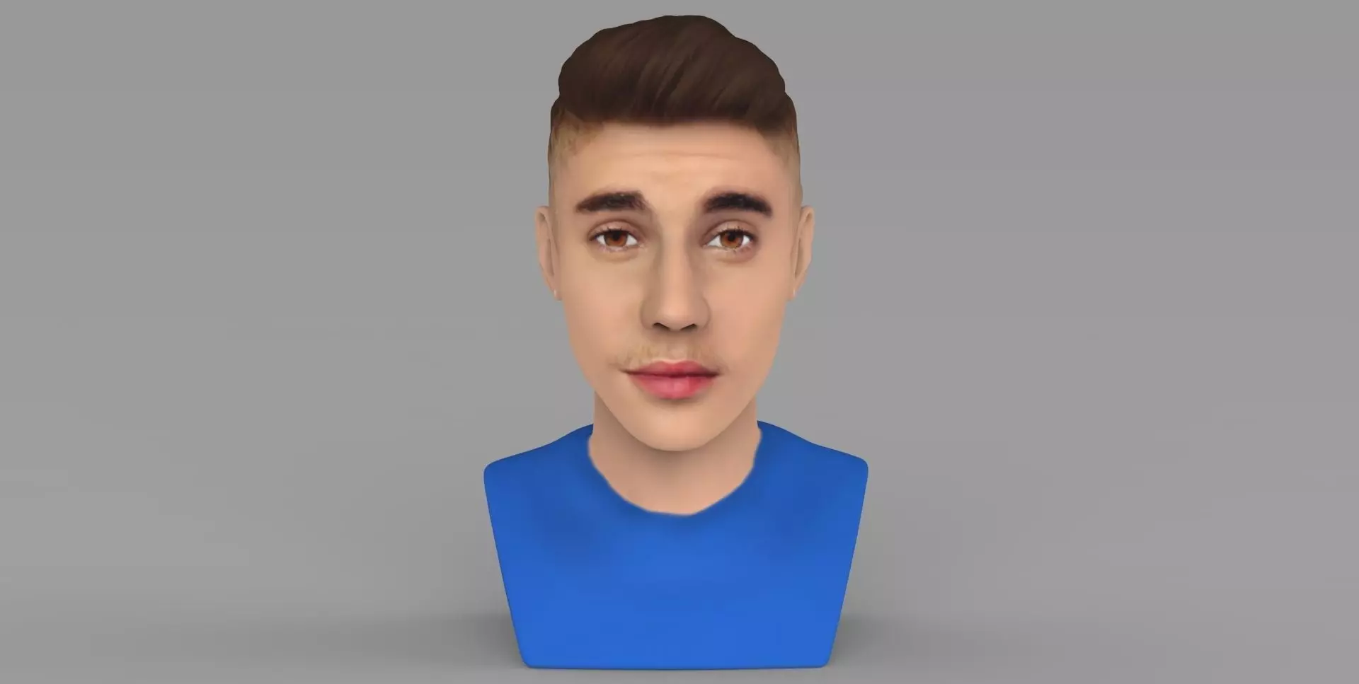 Here is Justin Bieber bust 3D model ready for full color 3D printing. The model is not scaled, so you will have to adjust this to the size you want. Zip file contains obj and wrl with texture in png. The model was created in ZBrush, Mudbox and Photoshop
