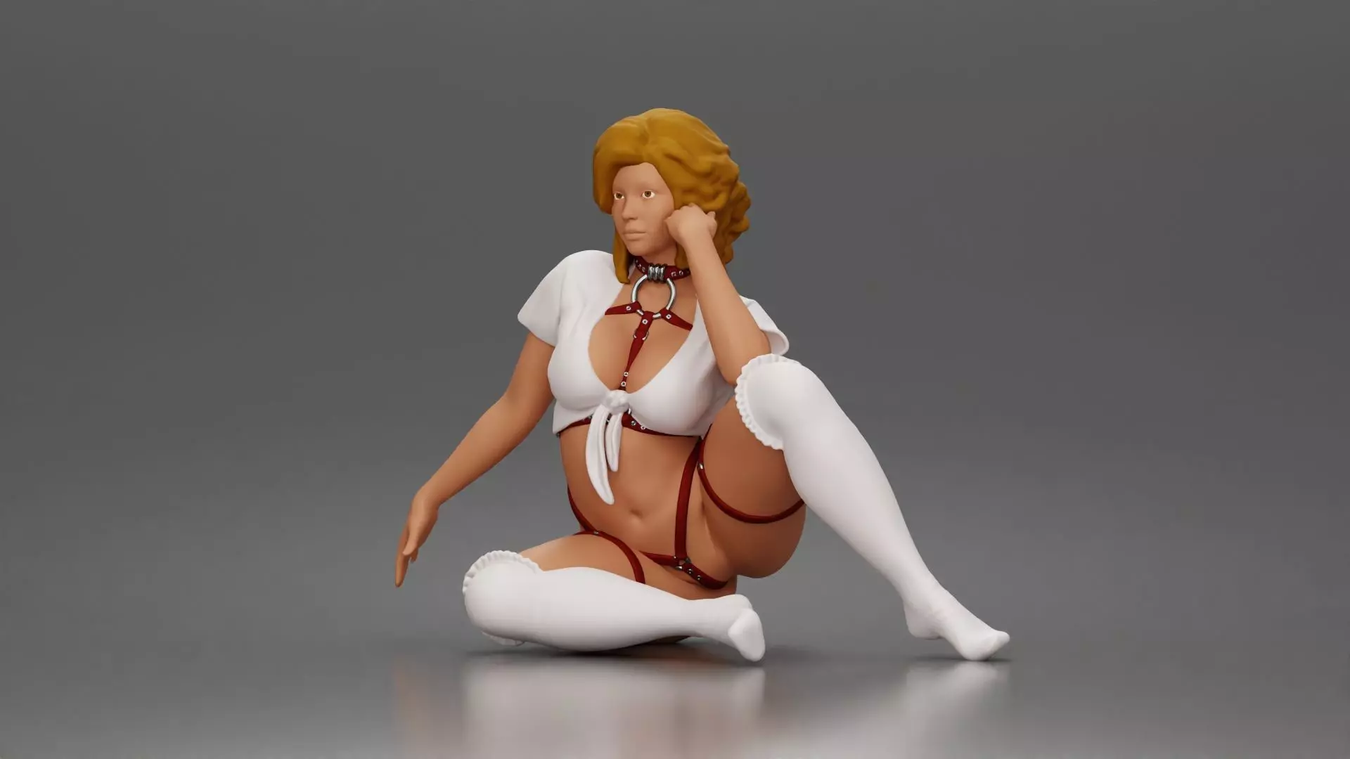 Kneeling woman wearing strappy harness lingerie garter stockings 3D print model