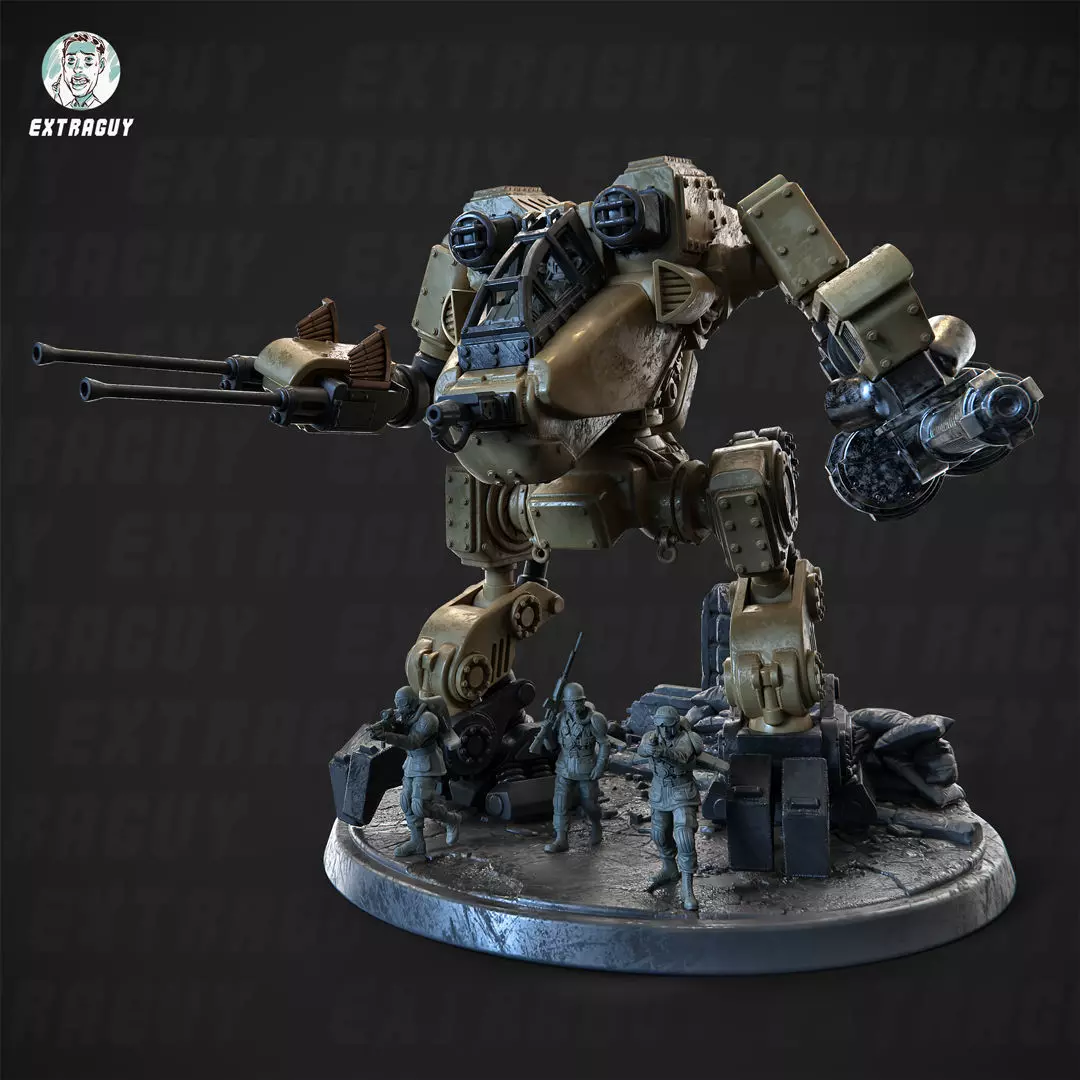 Ola, I present you the Konflickt 47 Linebacker 32mm Poseable setMech is about 145mm in height set to scale to a 32mm HumanApproximate dimension of the set plus (Mech+Base) are as followsHeight: 166mm Width: 161mm Depth: 172mmAsset is cut in parts for easy assemblycomes with 4 Weapons (HMG, Auto-cannon, Super Bazooka, Light Tesla Weapon,Chin mounted HMG and Flame thrower.Comes with a pilot and custom baseThe 3 ground Soldiers are sold separatelyAsset is cut in parts for easy assembly where youcan pose it before you apply glue to immortalized the model