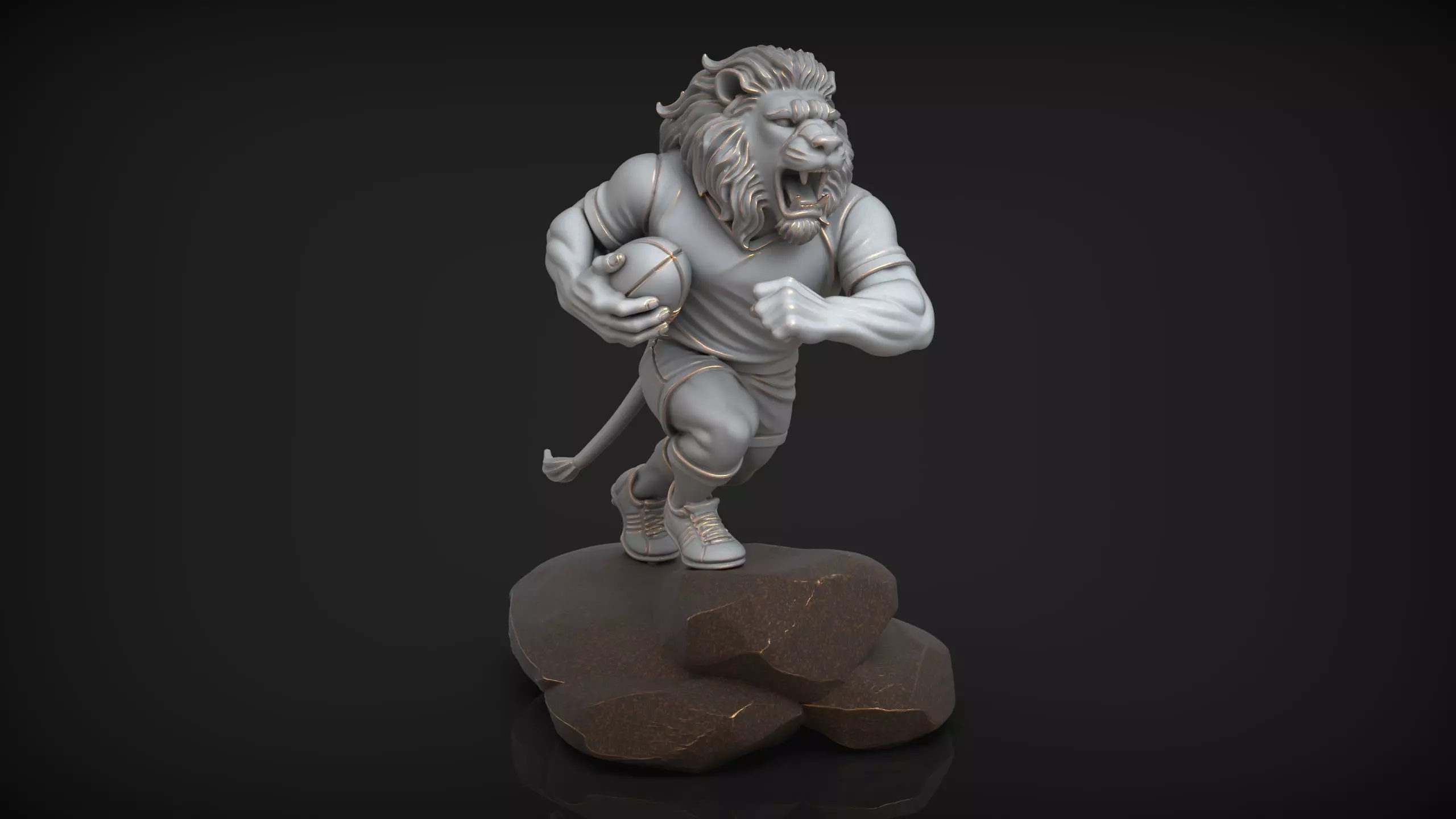This highly detailed 3D model depicts a powerful anthropomorphic lion playing rugby, captured in a dynamic running pose while holding the ball. The figurine combines strong anatomy, expressive facial features, and a stylized sports uniform for a striking display piece.