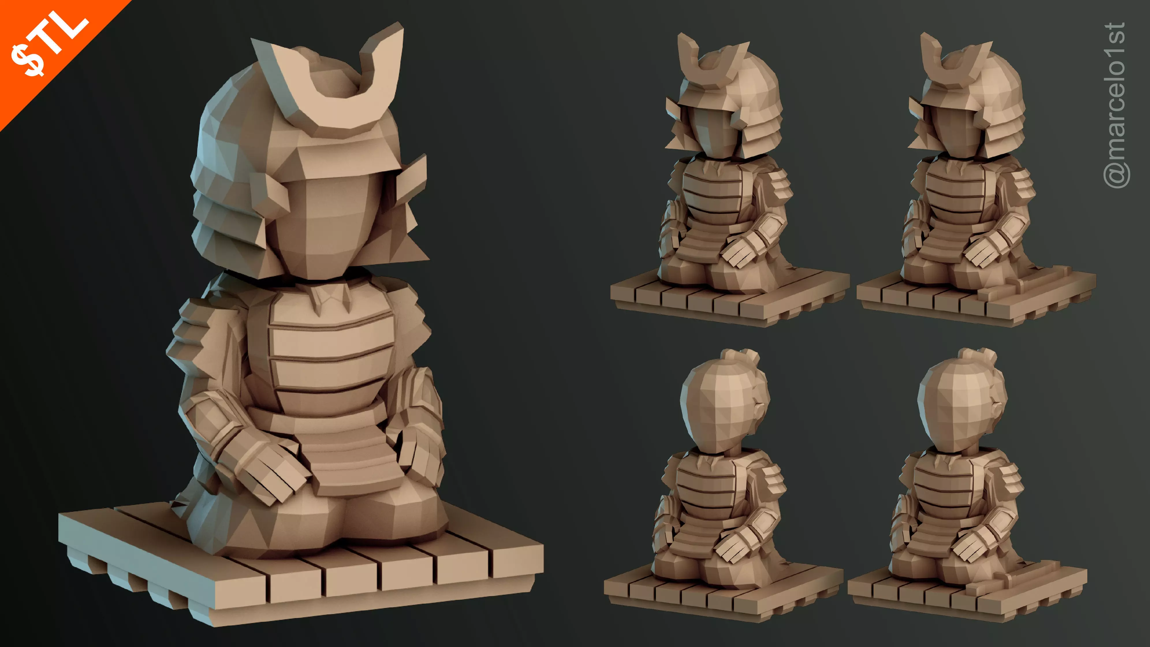 Presenting the Low Poly Samurai Figurine, beautifully designed to capture the essence of traditional Japanese culture. This delightful model showcases a samurai seated in seiza, the traditional way of sitting on the floor, symbolizing respect and tranquility. Crafted in a charming low poly style, this figurine offers an artistic blend of cute aesthetics and cultural significance.